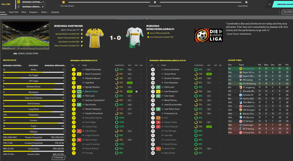 Then another big day in the Bundesliga saw us edge past Borussia Monchengladbach 1-0 with a Flores penalty on the same day that Leverkusen were losing 3-0 at fourth-placed Leipzig. And that moved us two points away from the title.