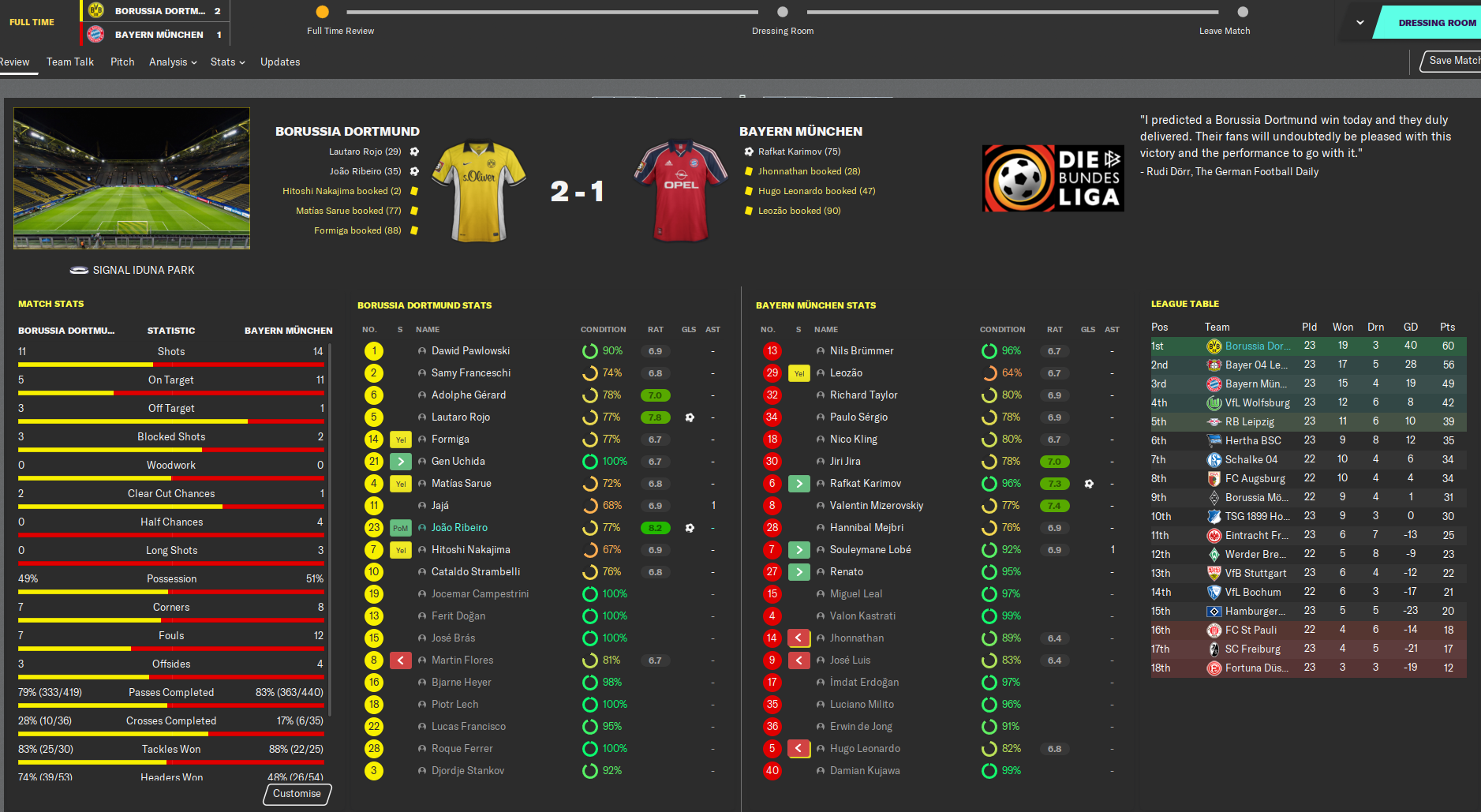And that teed up a vital Der Klassiker derby at home to Bayern managed by Jurgen Klopp, who’s been on an odd career path via Barcelona, Germany, Spain, France and Real Sociedad. We got off to a great start as Lautaro Rojo poked home after a goalkeeper howler then Joao Ribeiro smashed home from long range. Bayern pulled one back late on but we held on for a 2-1 win. On the same day Leverkusen lost at Hertha, which moved us 4 points clear of them and 11 ahead of Bayern.
