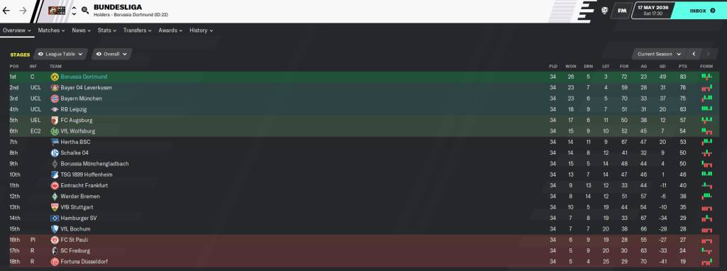 A nice relaxing winter break ended with a flurry of injuries heading into the first match of 2036. But no bother as we thumped Wolfsburg 4-1 led by a Cataldo Strambelli hat-trick that took him to 12 goals in 17 league games after last season’s tally of 31 in 31. The next day Leverkusen drew 3-3 at Bochum, who scored twice in the last ten minutes.