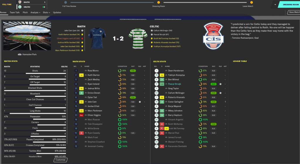 We held firm to claim a 1-1 draw but, with our players of course tiring, Celtic continued to dominate and eventually got the vital goal in the 97th minute. We did really well but, yet again, a rather unfair decision has cost us against Old Firm sides and Celtic were the League Cup winners.