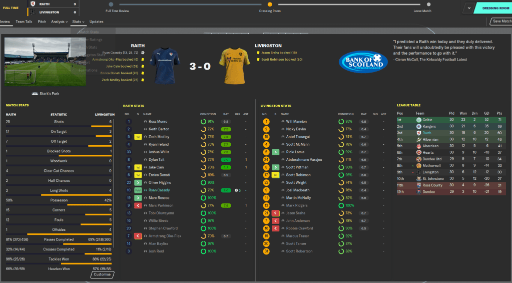 In the match after the cup final defeat we went behind early at home to Hibernian but a Ryan Cassidy brace ended his incredible 20-hour goal drought and inspired us to a 3-1 comeback. Then a brace by his strike partner Marc Roscoe, in for the injured Marc Parkinson, led us to a 2-0 win at bottom of the league Ross County.