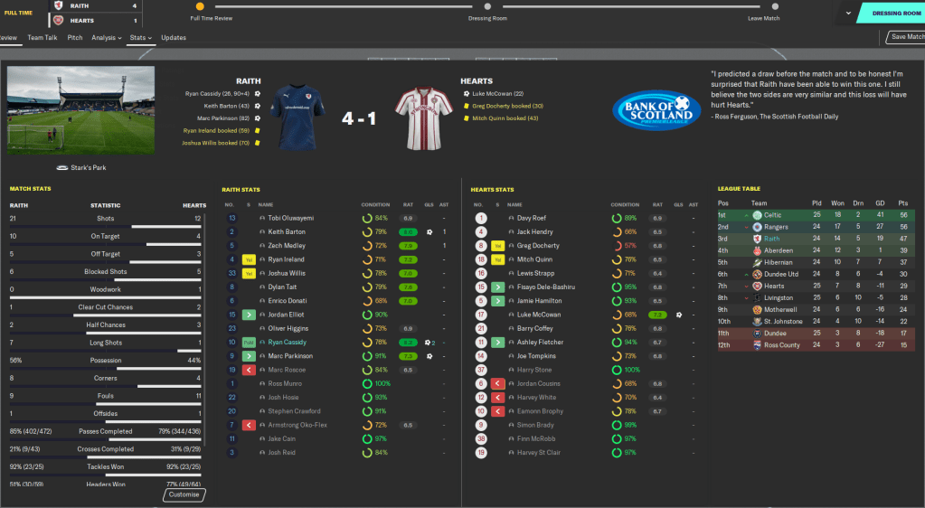 Our first game back after the break was at Celtic, and we put in a great defensive effort only for them to again score an injury-time goal to beat us 1-0. And that was swiftly followed by a trip to Rangers next up! Unsurprisingly, we lost again but also acquitted ourselves well and only lost 3-1 to two late goals – and all three of their goals were from set-pieces.