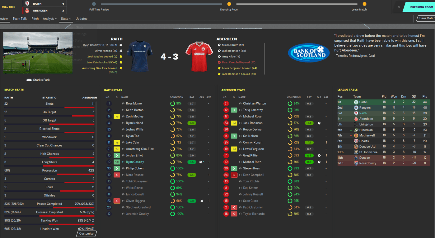 Cassidy was now full of confidence, which inspired him to score twice and create a goal for Higgins inside 17 minutes at home to Aberdeen. The visitors got one back just after half-time and we somehow managed to give them two more, which saw them come back to 3-3. However, Cassidy had the last laugh as he nodded home from close range to win it in the 95th minute. And that saw us move 9 points clear of fourth-placed Aberdeen.