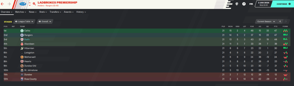 A 1-1 draw at St. Johnstone took us to ten games unbeaten and saw us go into the winter break in early 2024 sitting in third place. Remarkably, we were only three points behind Rangers and Celtic – who’d seemingly had a huge slump in form – eight ahead of Aberdeen in fourth and 14 clear of European qualification.