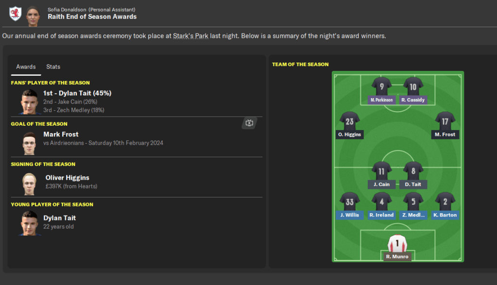 Tait, who played every league game this season, took home the fans’ player of the season award for the first time with 45% of the vote, followed by Cain (26%) and Medley (18%), who is out of contract this summer but wants way more than we can afford. Tait, who’s still only 22, also won young player of the season.