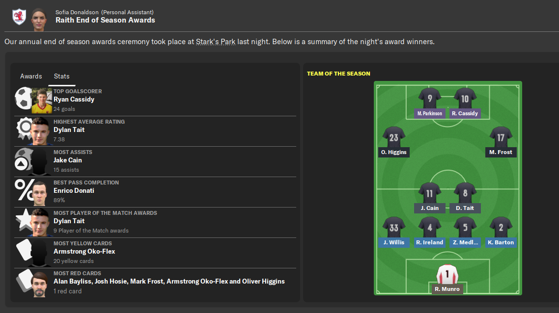 Midfielder and captain Dylan Tait also impressed, scoring five and assisting 11, getting the top average rating of 7.38, and setting a new club record of nine player of the match awards.