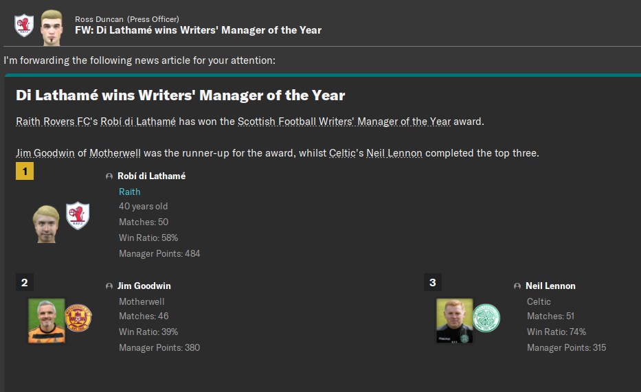 Away from the players, I took a clean sweep of Player’s Manager of the Year and Writers’ Manager of the Year. Result!