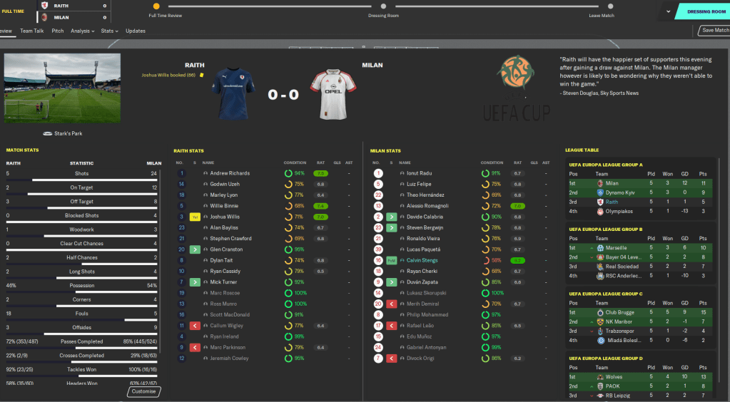 The group began with the most difficult game, at the San Siro against AC Milan. We held Milan for the first half, then the unthinkable happened as that man Binnie headed home from an Uzeh free-kick to give Raith Rovers the lead… at the San Siro! However, Milan immediately got given a very dubious penalty that Franck Kessié converted. He then got sent off and we held on to earn a great away point.