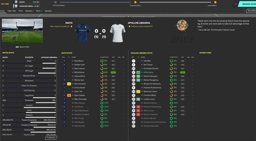 Raith’s European adventure began with a trip to Cyprus to face Apollon Limassol in the Europa League Playoff. We fell behind early in the second half but Binnie leapt highest from a corner to nod home a vital away goal and equaliser. Then a 0-0 draw in a return leg that we dominated was enough to seal progression to the Group Stage! And that means one thing – money! – with £2.51 million for qualification alone.