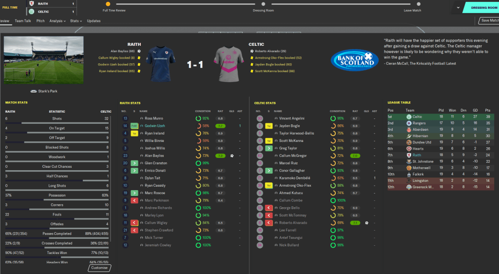 And we claimed our second draw of the season against Celtic and a third of the season against the Old Firm by holding them to a 1-1 draw thanks to Bayliss’ late header from a corner. Although they will feel done by given they had 32 shots to our 6!