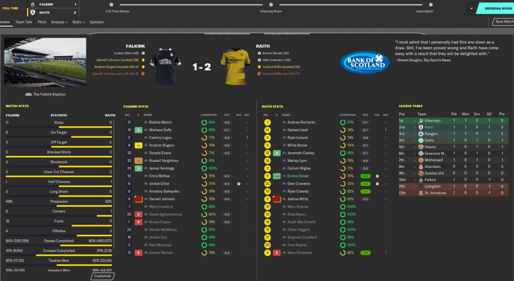 The new season began with a trip to Falkirk and we made a solid start by racing into a 2-0 first-half lead through a Donati screamer and a first for the club from Cranston. But we let the hosts back in as our former winger Jordan Elliott scored, then we had Willis sent off and hung on for a 2-1 opening day win.