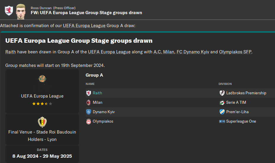 We got handed an exciting – yet difficult – group stage up against AC Milan, Dynamo Kyiv and Olympiakos. And our performance in reaching the group stage resulted in the Board offering me a new contract worth £3,500-per-week until 2027.