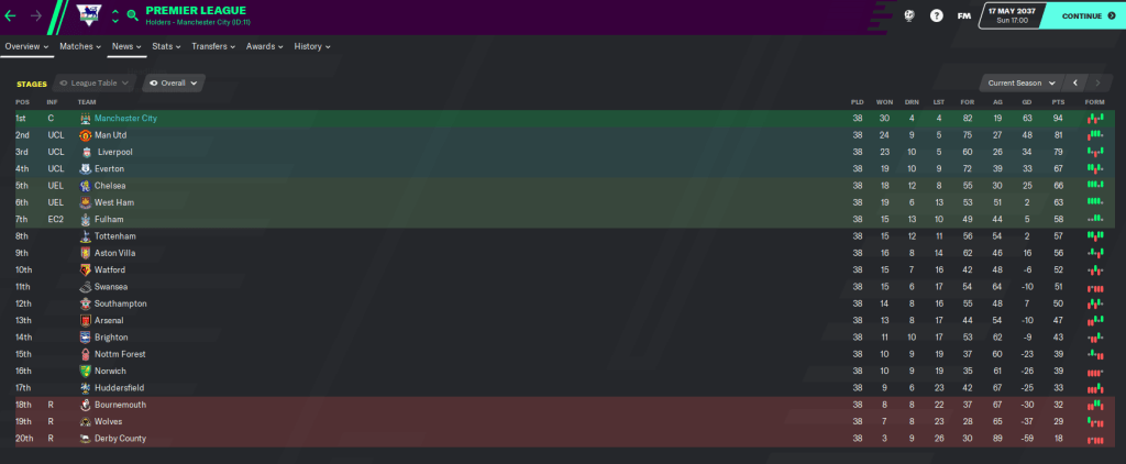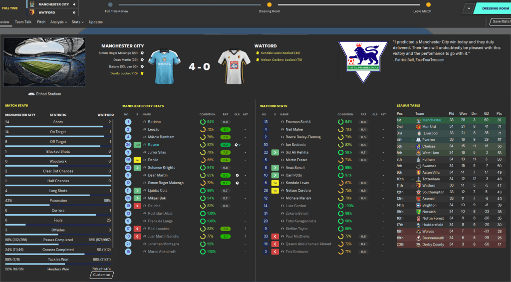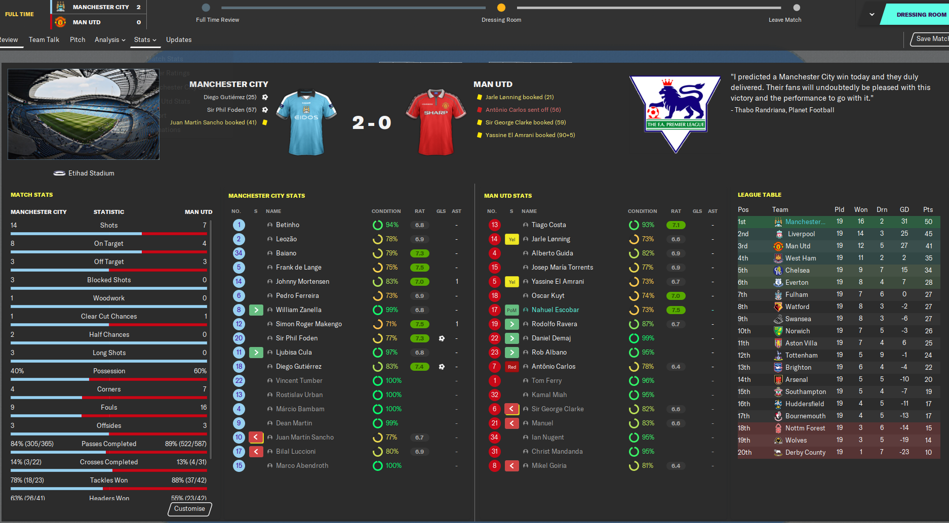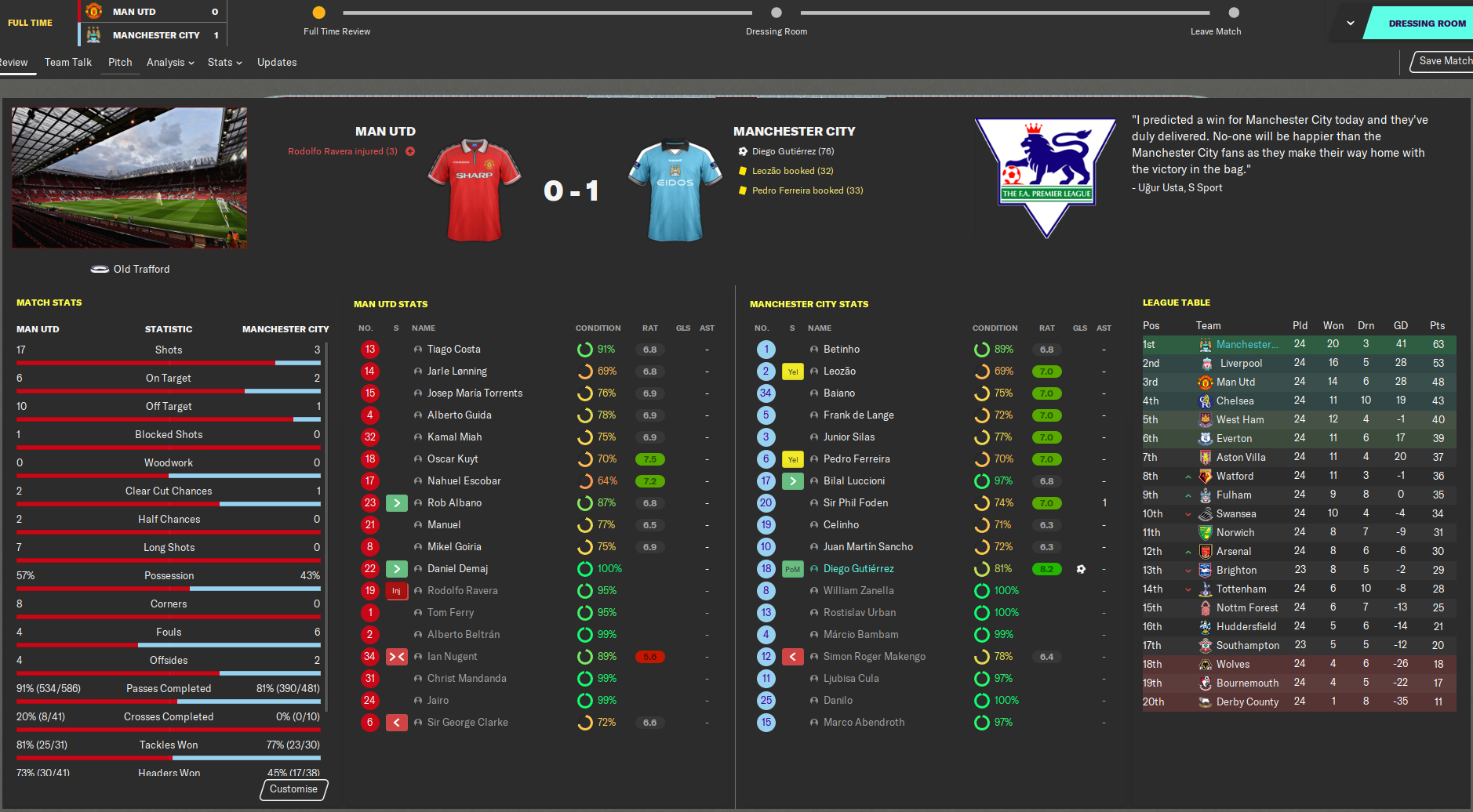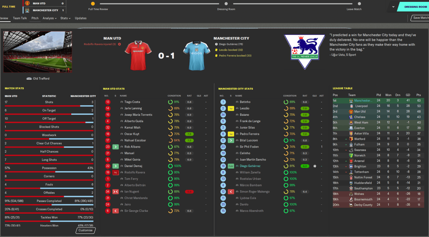 And that teed us up nicely for a second Manchester derby, this time at Old Trafford. We managed to soak up their massive pressure and gave them a real FM-ing as Sir Foden lofted a ball over the top for Gutiérrez to race home and smash home the winner. Liverpool drew two in a row, which moved us a huge ten points clear!