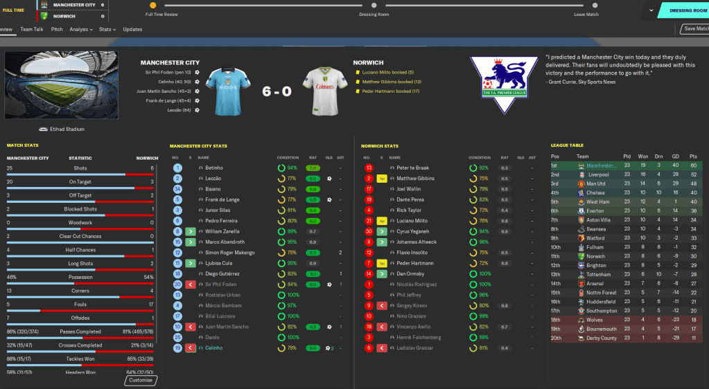 City had won the EFL Cup the previous season, and we continued that cup form by breezing through to the semi-finals where we got a decent draw against Norwich. And it was basically over at half-time of the first leg as we led 3-0, then continued to win 5-0. I rotated for the away leg and we won 1-0 to reach the final, which is an all-Manchester affair!