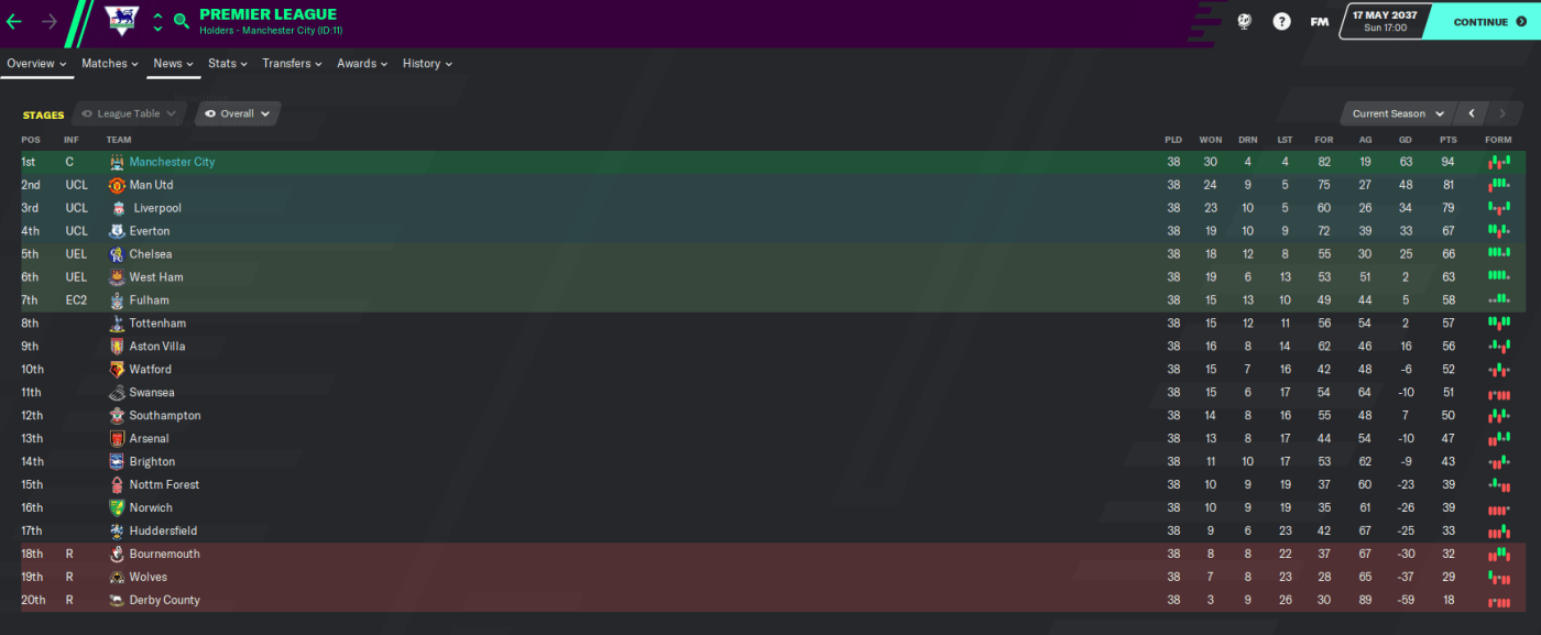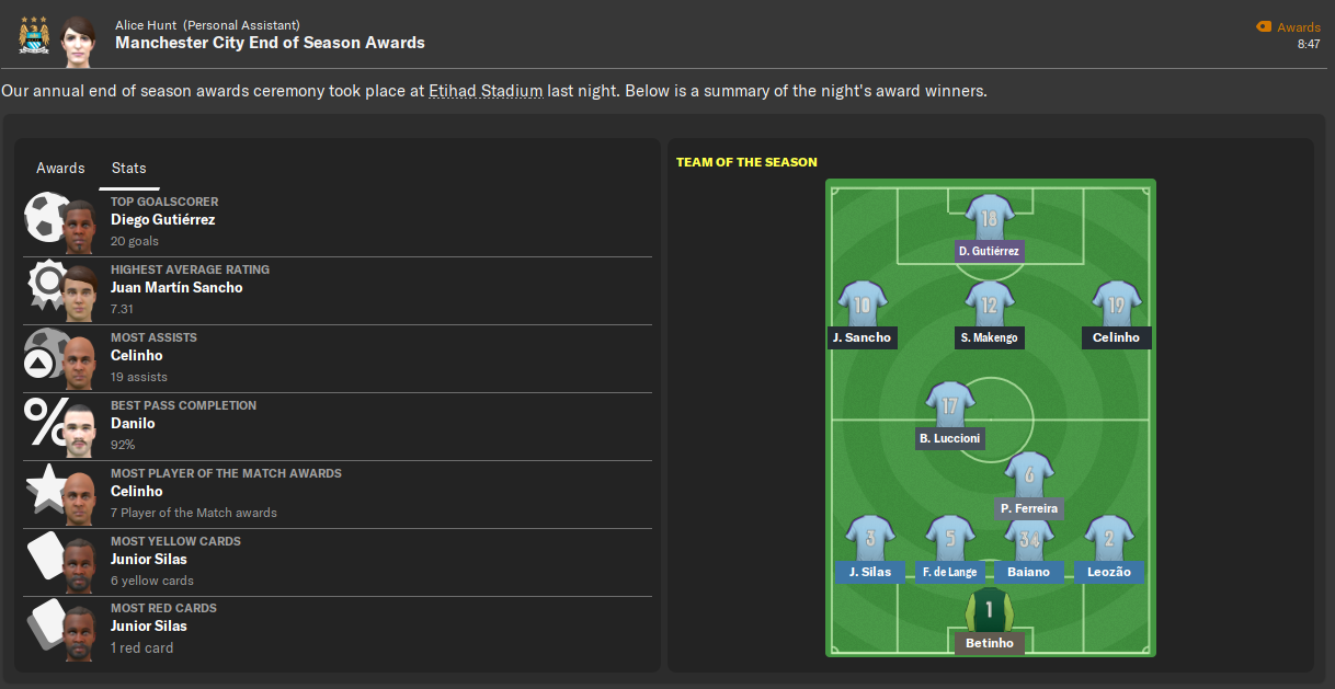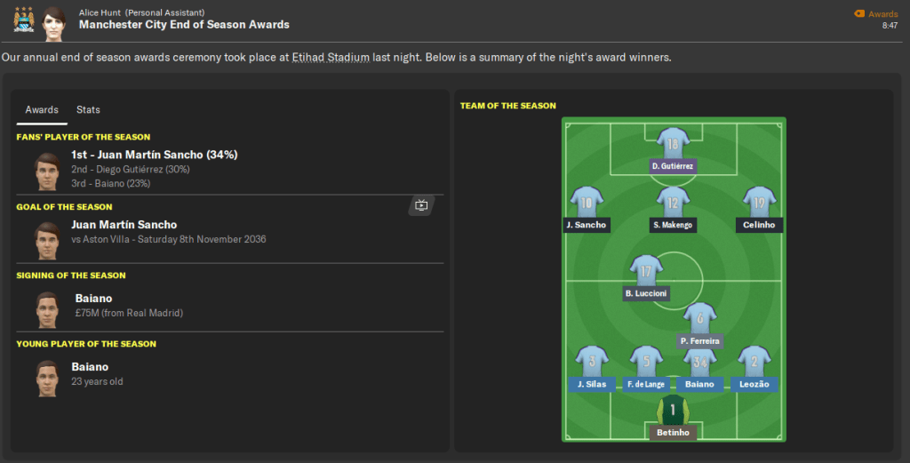 My first season managing in my English homeland was a huge success as I led Manchester City to a first Premier League title in 12 years in the 2036/37 campaign.