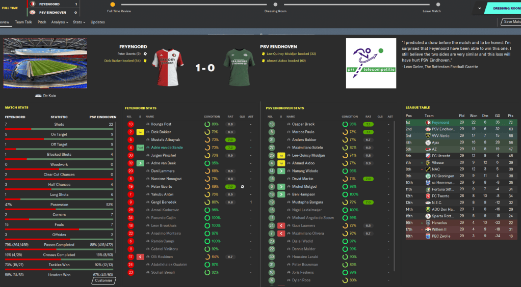 Life in Holland had gotten off to a flyer as we led Feyenoord to the top of Eredivisie with a healthy ten-point lead over PSV Eindhoven, who had a game in hand, moving into 2038.