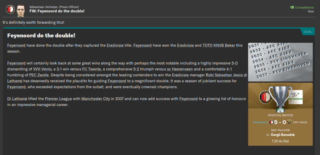 Join us next time as we look back on a great first season in Holland! I thought Feyenoord was going to be a massive challenge, but our three best players were enough to lead us to a huge league and cup domination!