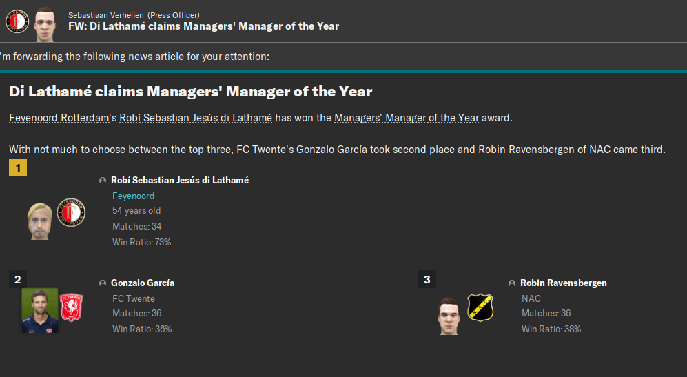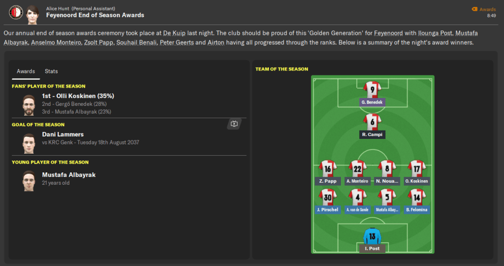 Koskinen won the fans’ player of the season with 35% of the vote, followed by Benedek (28%) and centre-back Mustafa Albayrak (27%). Lammers won goal of the season, which surprisingly wasn’t his ridiculous overhead kick against Ajax. And Albayrak won young player of the season. While I won the Eredivisie Managers’ Manager of the Year award.