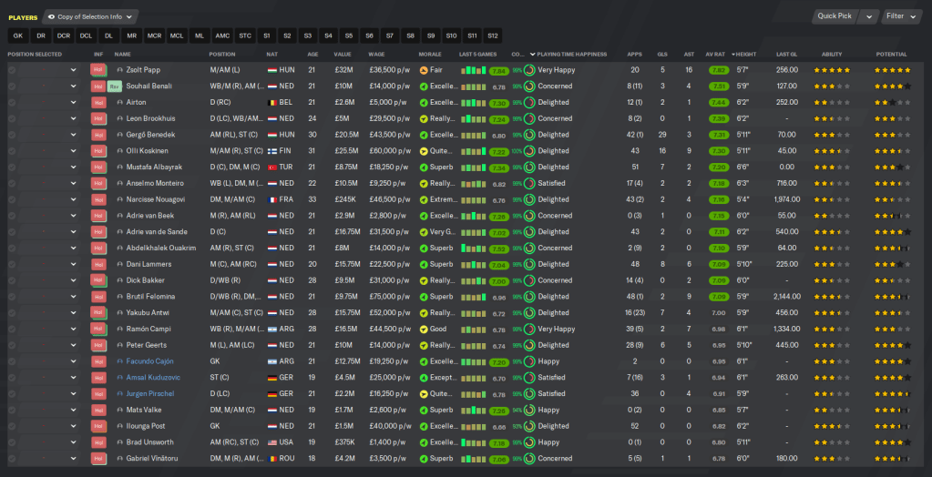 The exciting Papp also led the way with 16 assists and a ridiculous average rating of 7.82 from just 20 appearances – as he was constantly injured. Right-back Brutil Felomina chipped in with nine assists as did Koskinen. Attacking midfielder Ramon Campi only mustered seven assists and two goals from 44 appearances, so he’s getting sold! Lammers and Geerts both got five assists.