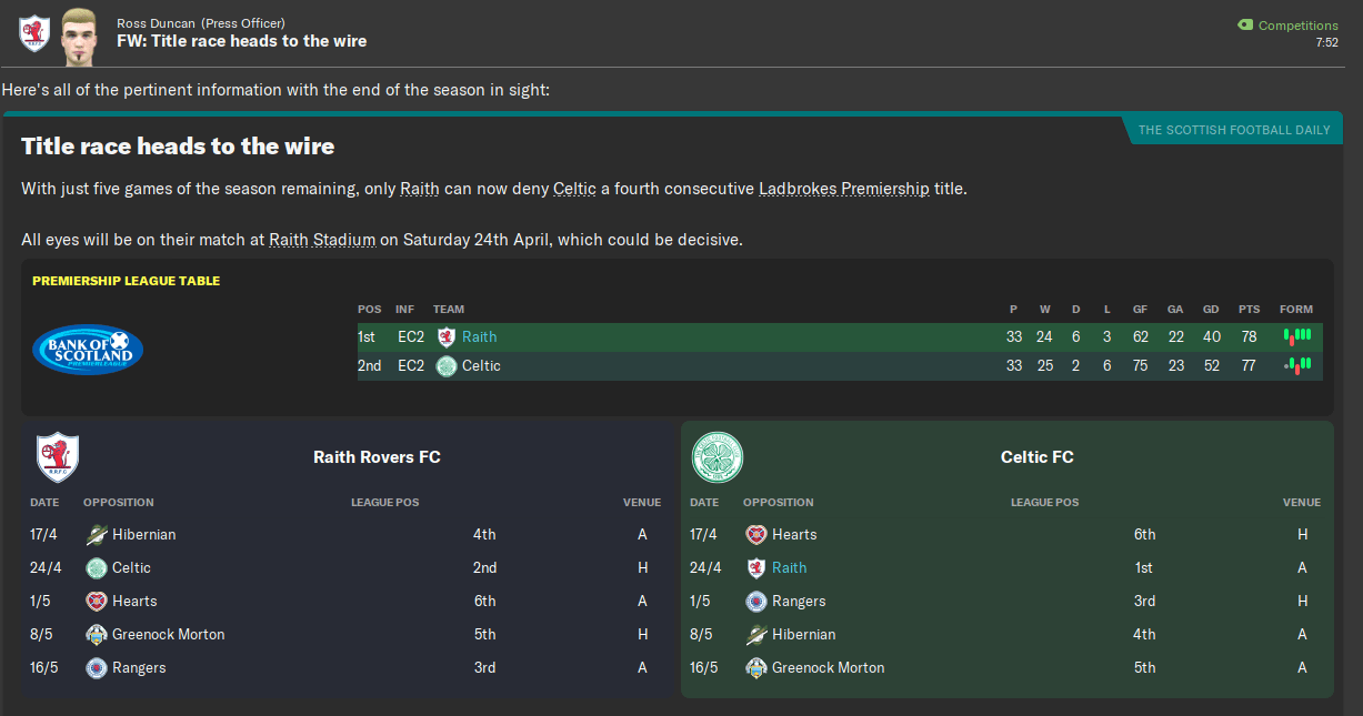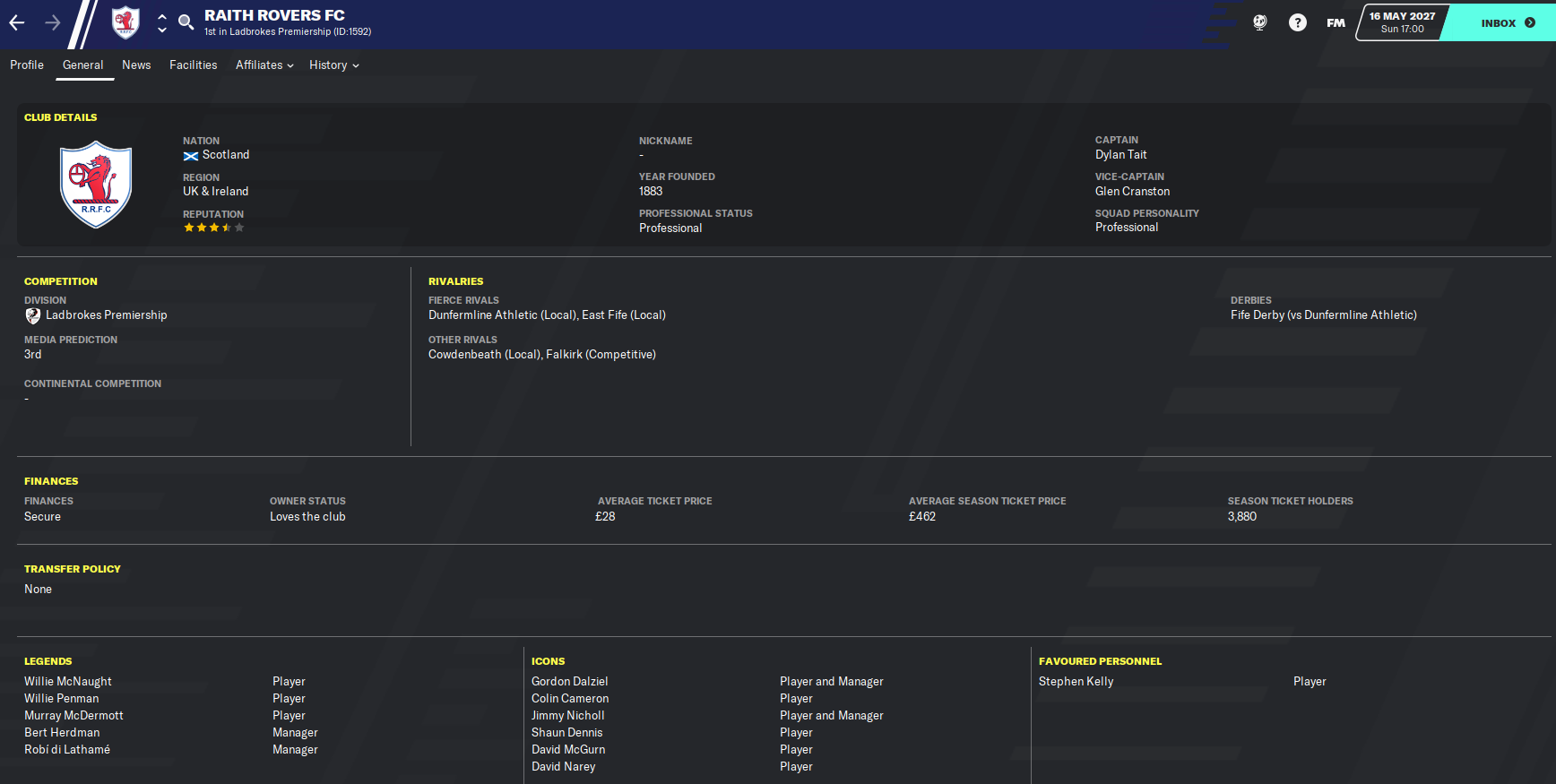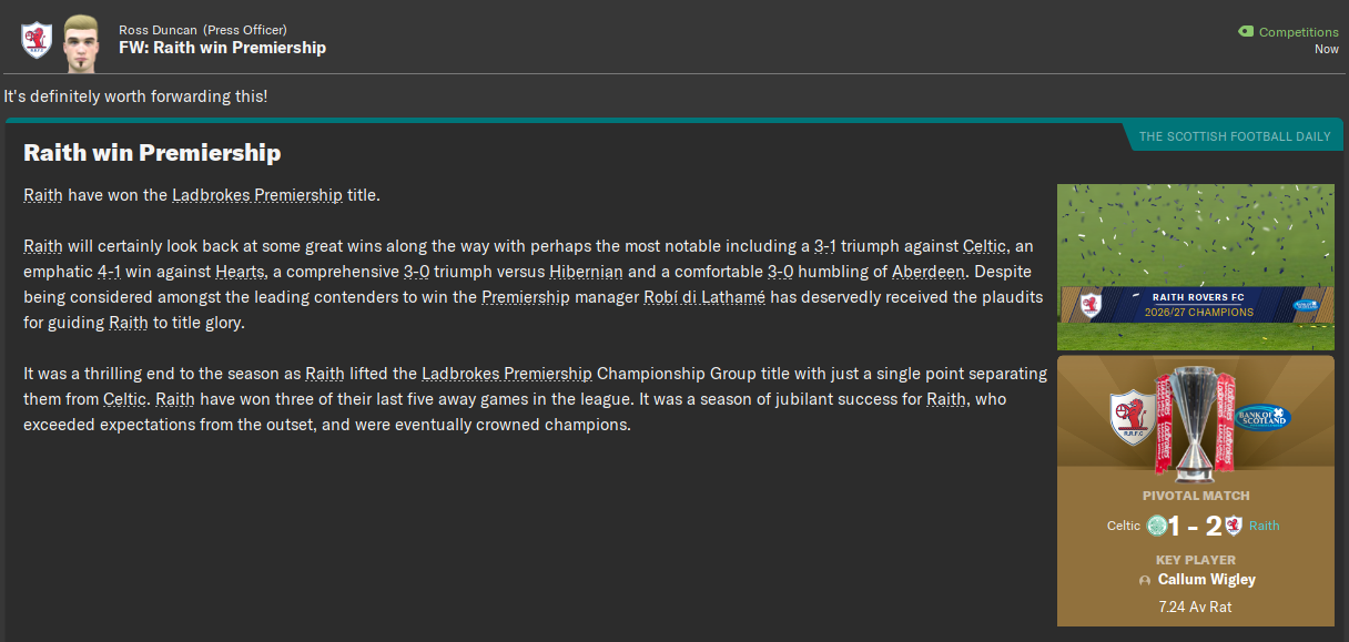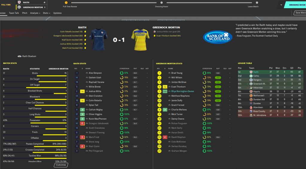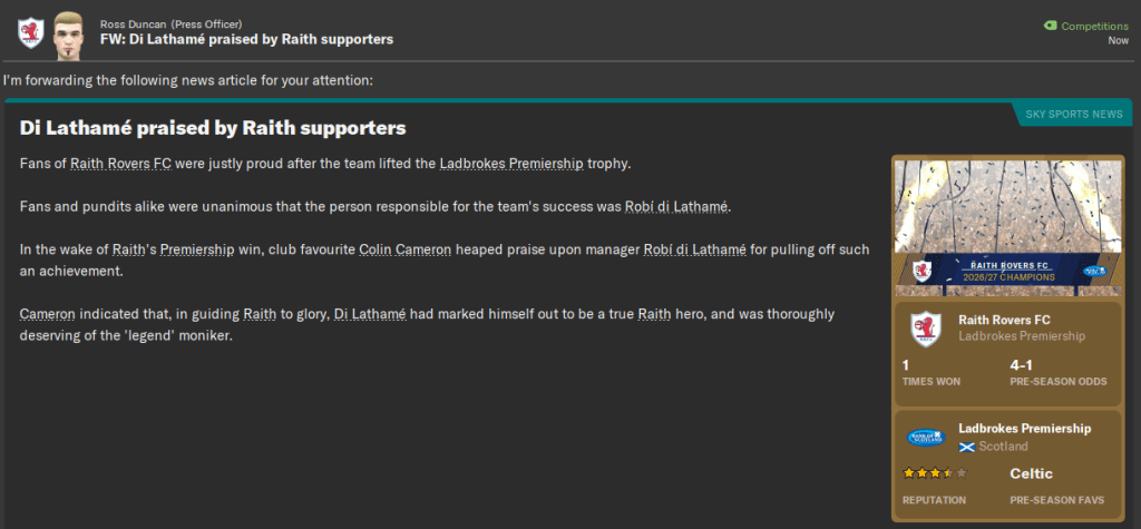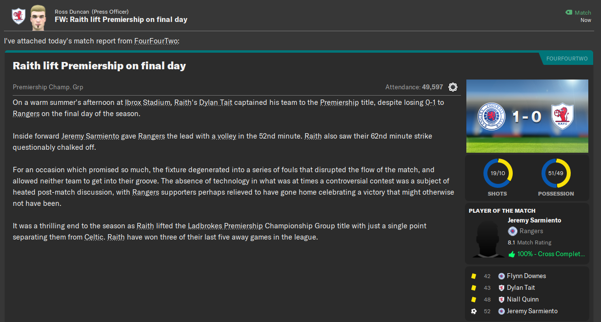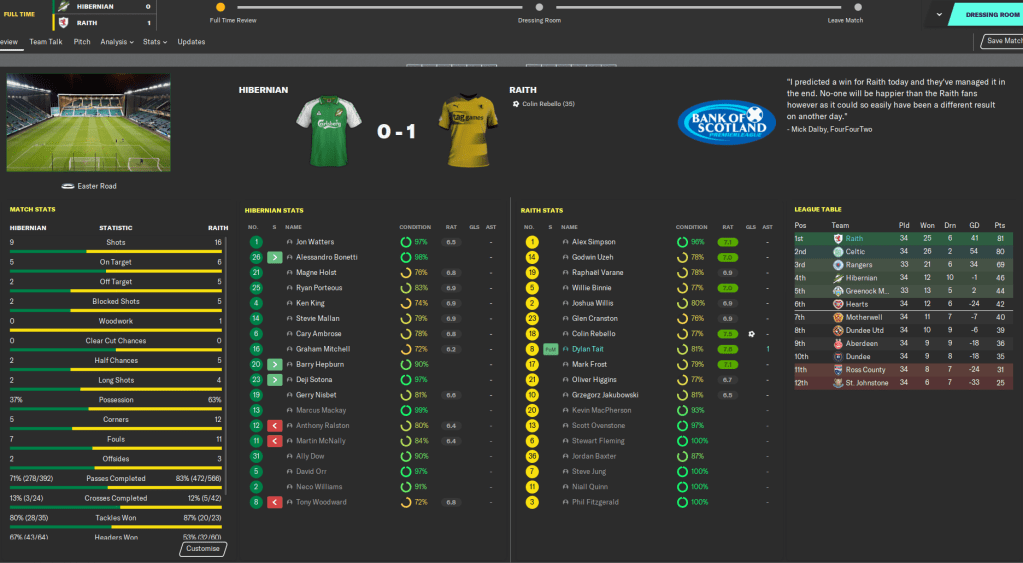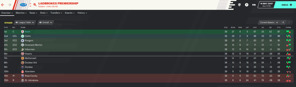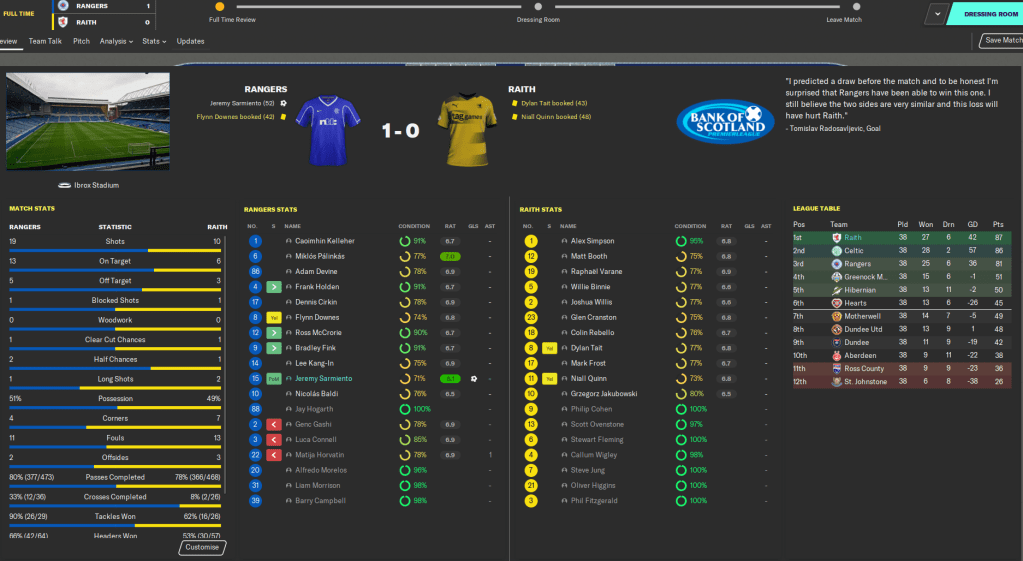 Taking Raith from League One to champions of Scotland in eight seasons has to be up there as my top achievement in Football Manager, ever. It’s up there with taking Boreham Wood to Premier League champions and making Atalanta the best team in the world. But I think with the finances – we still only have £15 million in the bank – and player quality, and given the tight Brexit restrictions in place, this one probably outshines them.