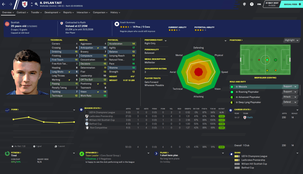 Just to prove this point, we’ve won the Scottish Premiership captained by Dylan Tait, who has been with Raith since the very start of the save and still remains a starting midfielder. His physical attributes are solid but the rest, well, aren’t brilliant. But, he has been exceptional throughout this journey, racking up 322 appearances for the club in that time.