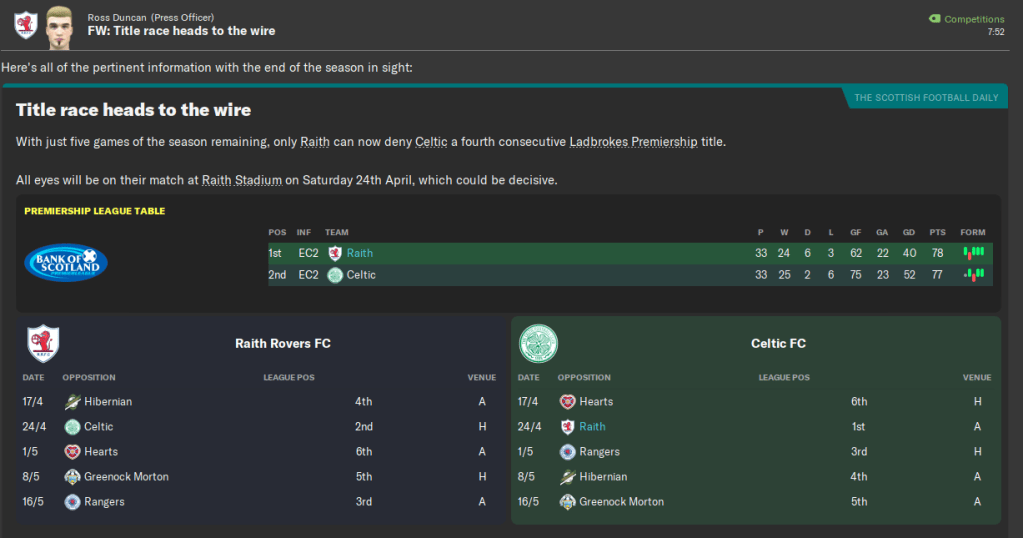 That is exactly the case as, on 3 April 2027, Raith Rovers have just convincingly defeated Hibernian 3-0, sending them into the Premiership’s end of season table split top of the league. Every team in the top half now has to play each other once, and Raith lead Celtic by one point.