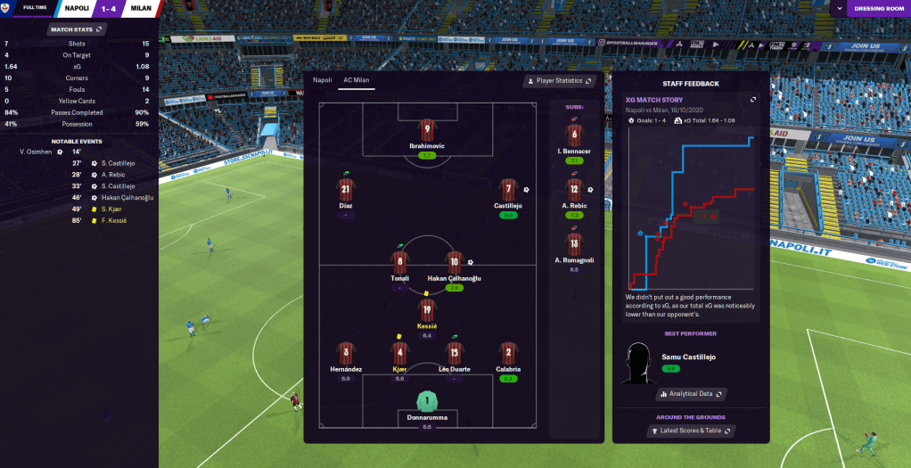 Zlatan bagged a brace the day after his 39th birthday as we eased to a 3-0 win at home to Benevento. We then went behind early at Napoli but a brilliant outside of the foot finish from Castillejo got us level, he then teed up Ante Rebic to smash home from 30 yards and bagged a second to put us 3-1 up at half-time. He carried on the good times by teeing up a Hakan Calhanoglu screamer 18 seconds into the second half, and his 9.6 effort offered an early contender for performance of the year!