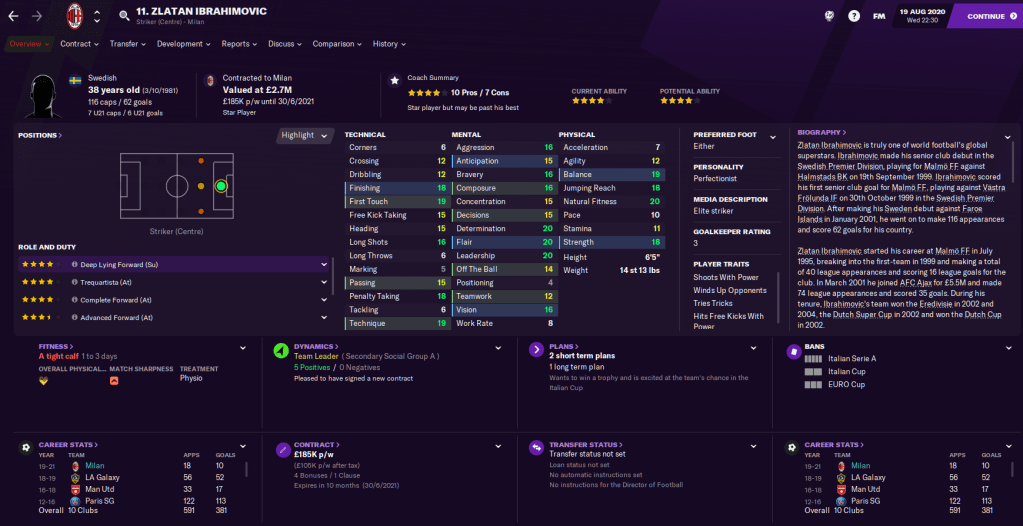 We start the game with zero money – cheers Covid – and we have a solid enough side that’s on the right side of things age-wise, with the exception of old boy Zlatan. But, that led to me not signing a single player during the first transfer window!