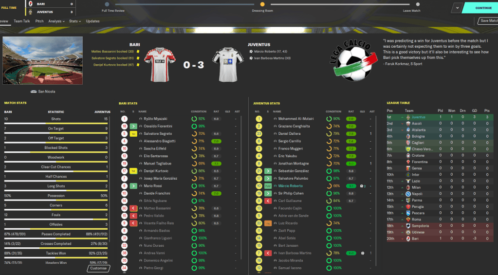 We got off to a flyer in the opener at Bari as Barbosa Martins put in a great run own the right and crossed for opposite winger Márcio Roberto to nod home. Barbosa Martins did it again 14 minutes later to set up an attack before getting into the middle to score on his debut. Just before half-time Márcio Roberto doubled his tally, taking a corner then picking up the loose ball to smash home from a narrow angle. 3-0 at half-time and that’s how it stayed. And, Inter lost their opening game at home to Napoli!