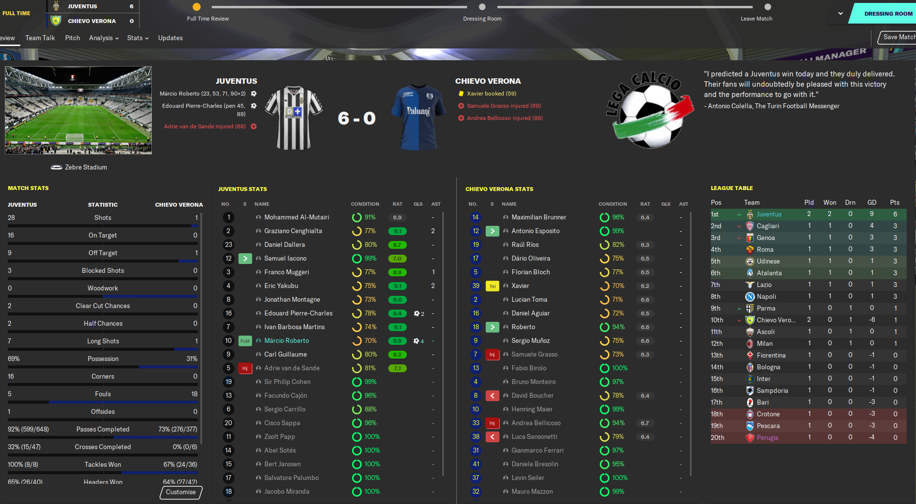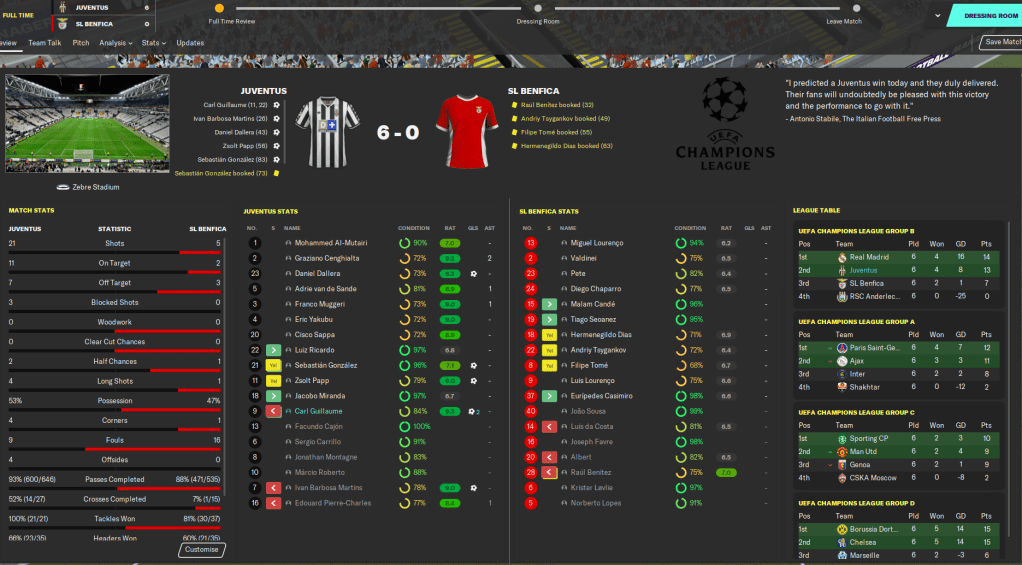 Another big test followed as we went to AC Milan, who were fresh from a 6-1 battering at Parma, but we couldn’t score as we dropped our first points in a 0-0 stalemate. That was forgotten as we smashed Crotone 4-0, Fiorentina 4-1 and Perugia 4-0, in which Sir Cohen scored his first Juve goal.