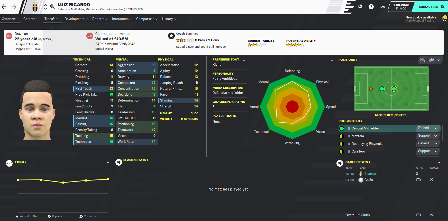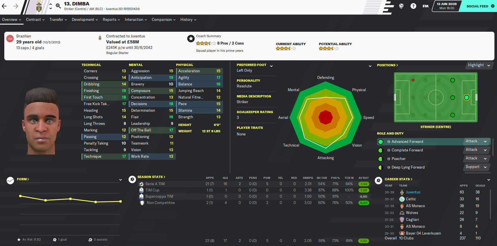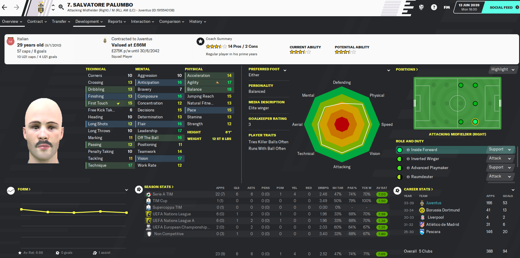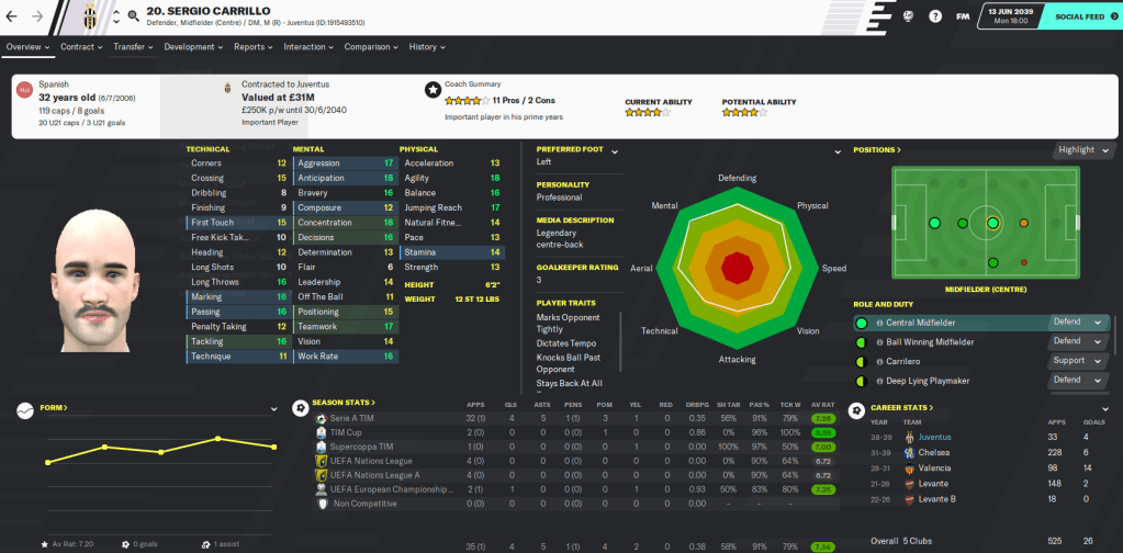 There are also a few familiar faces in midfielder/centre-back Sergio Carrillo, who I signed for Valencia 11 years ago, Brazilian striker Dimba who we had on loan at Cagliari, and right-winger Salvatore Palumbo, who Juve signed from me at Dortmund in 2034.