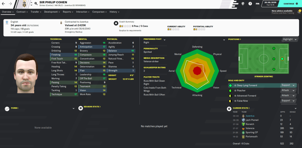 And, as one final nostalgic move, I noticed that Sir Philip Cohen, my Sporting and Valencia striker and the captain of my England World Cup winning team, was available on a free transfer. Despite him being nowhere near the quality required anymore, I swiftly snapped him up to add depth up front.
