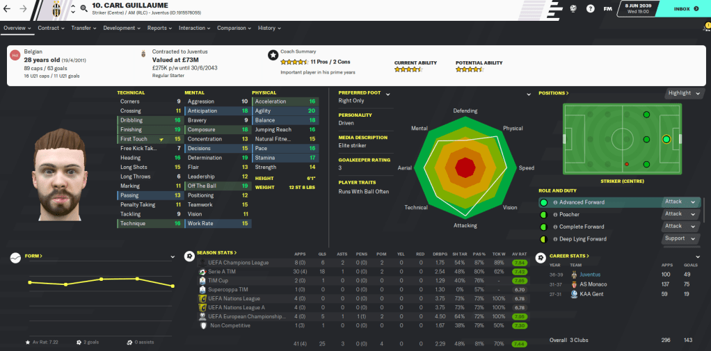 Despite that gulf, Juve do have a wealth of talent in their first-team squad. The player I’m probably most excited about managing is Belgian striker Carl Guillaume. He is an absolute monster of a striker!
