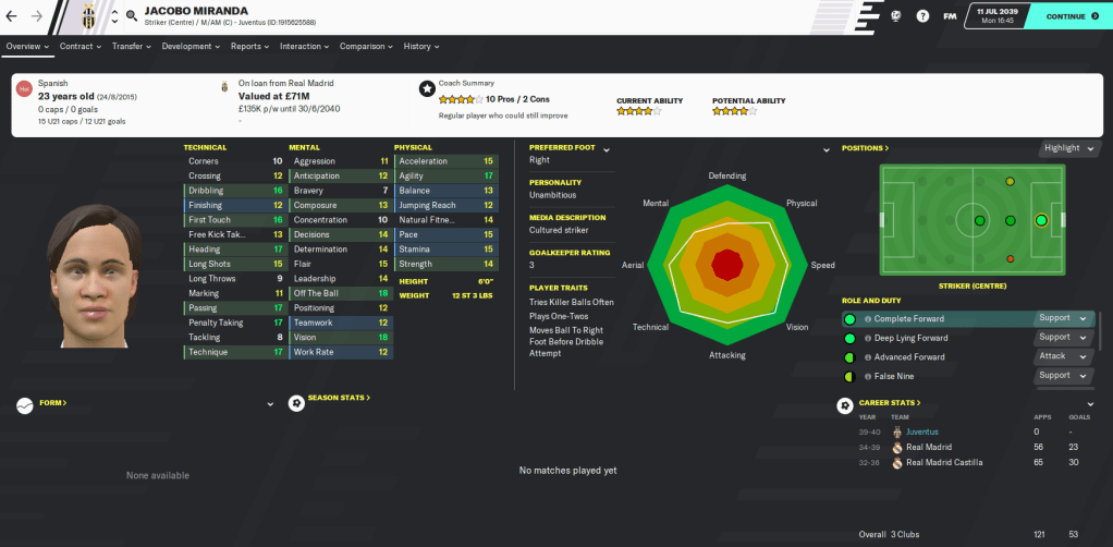We also bolstered our attack with the loan signing of Real Madrid striker Jacobo Miranda, who scored 14 goals in 26 games for Real last season. The main area we were lacking was midfield depth, which I addressed by returning to Feyenoord to sign Jonathan Montagne for £30 million.