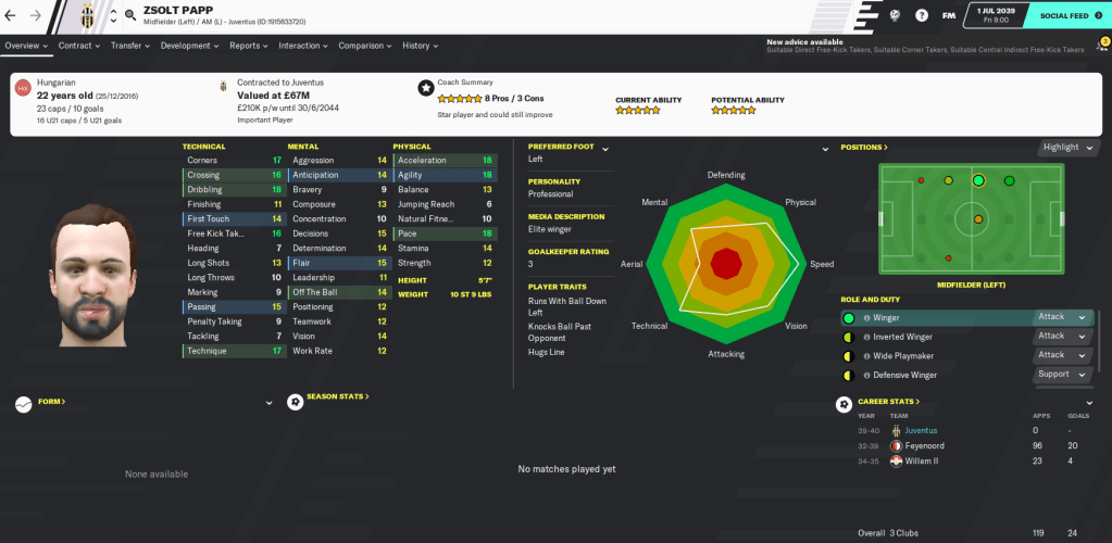I began the summer by shipping out some of the deadwood Juve had amassed, bringing in over £200 million. That gave us plenty of cash to burn and I swiftly set about doing that, spending more than £130 million. And, with the fact that FM21 is just around the corner, I utilised a transfer policy of buying players that will improve the first team and a tactic of adding clauses like ‘50% of next sale profit’ to help us spend less money up front.