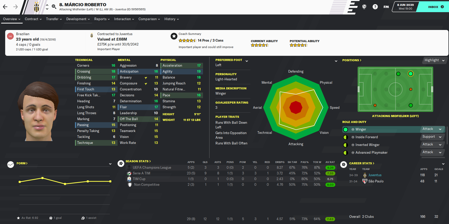 But the player my coaches believe is the best at the club is Brazilian left-winger Márcio Roberto, whose attributes are pretty impressive but he needs to be a bit more consistent.