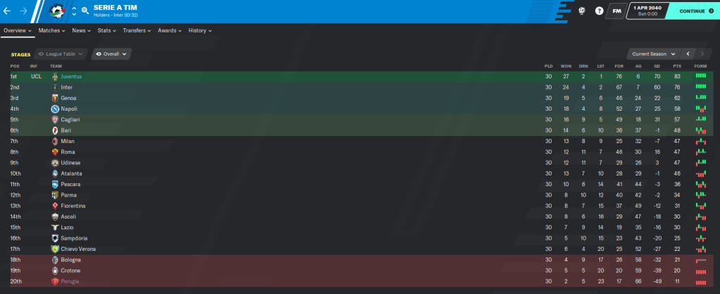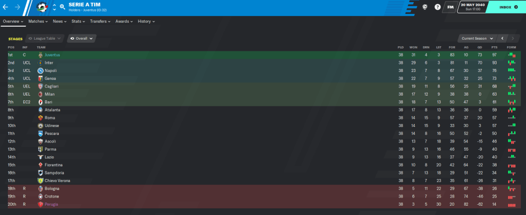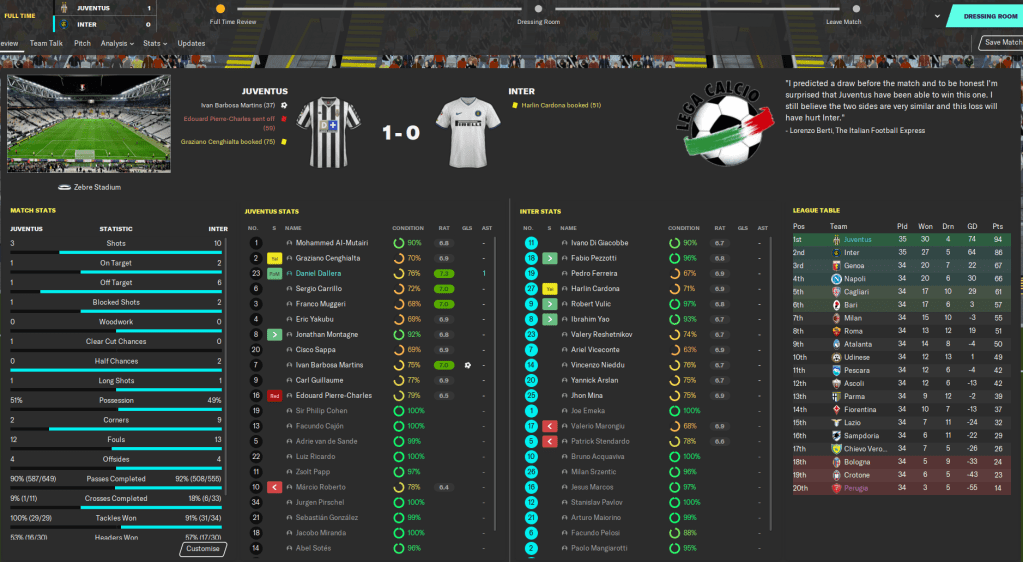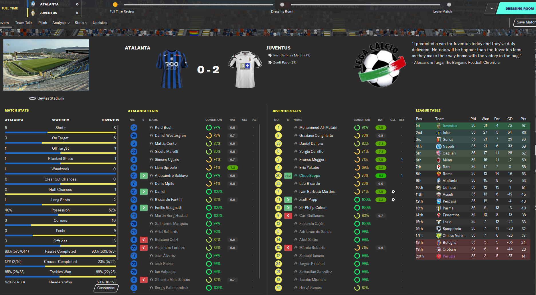 That was followed by an Italian Cup Final against Inter, for which I had to fully rotate a knackered and very injured squad, and lost 3-0. And the rotation continued for the final two games, the first of which we lost 2-0 at home to former club Cagliari then a 1-0 loss at Udinese.