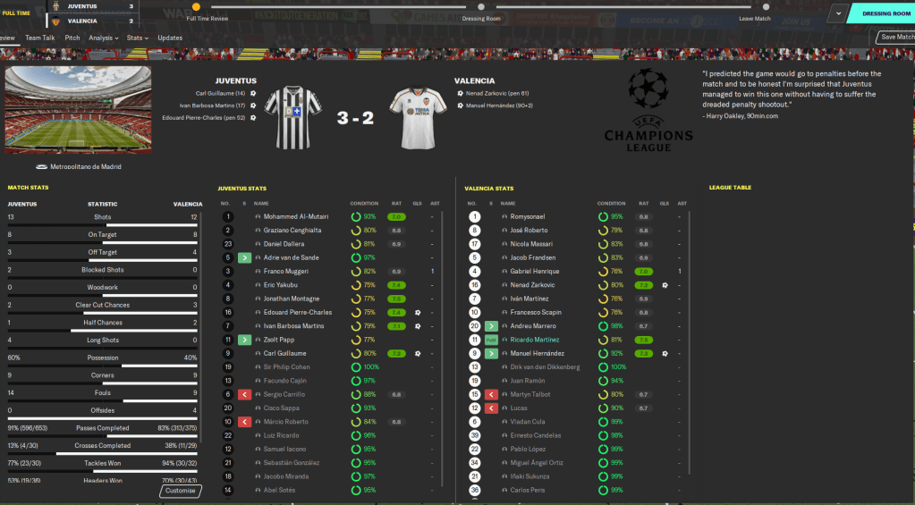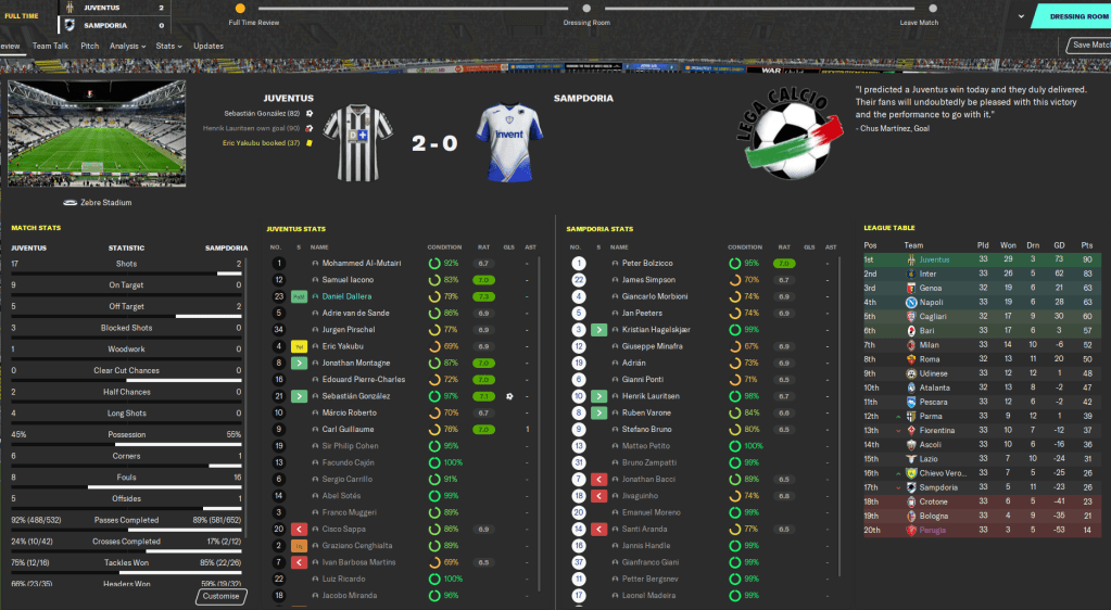 The timing of this win is vital as it may well be the final season of this 21-year save. It’s been a long time coming but this Juve team has to be the best, in terms of sheer quality, that I’ve managed during this time.