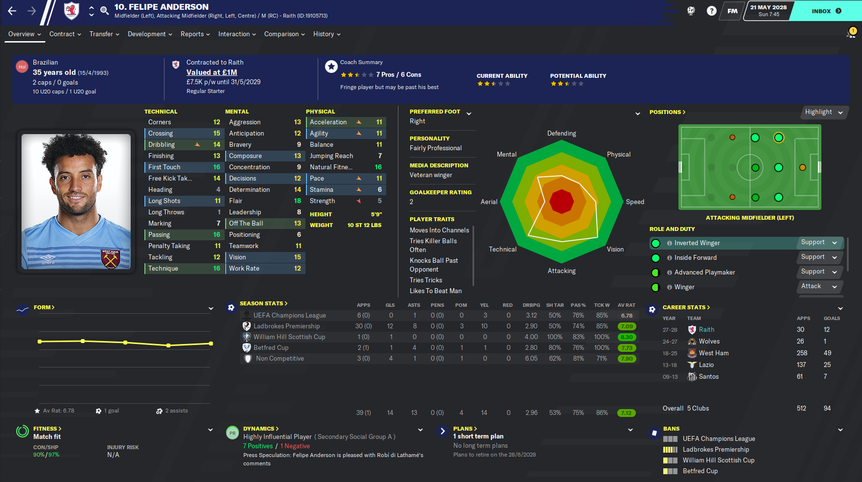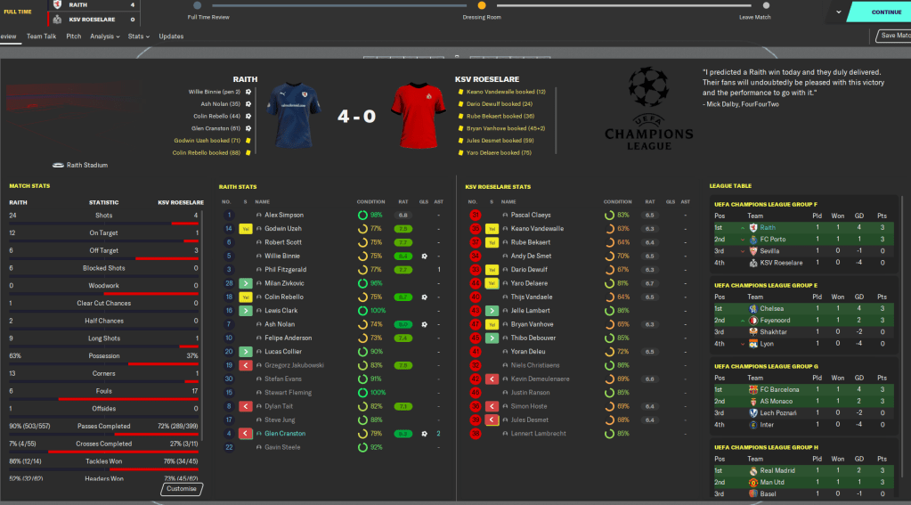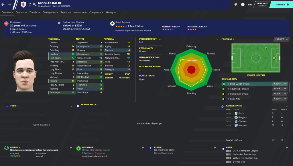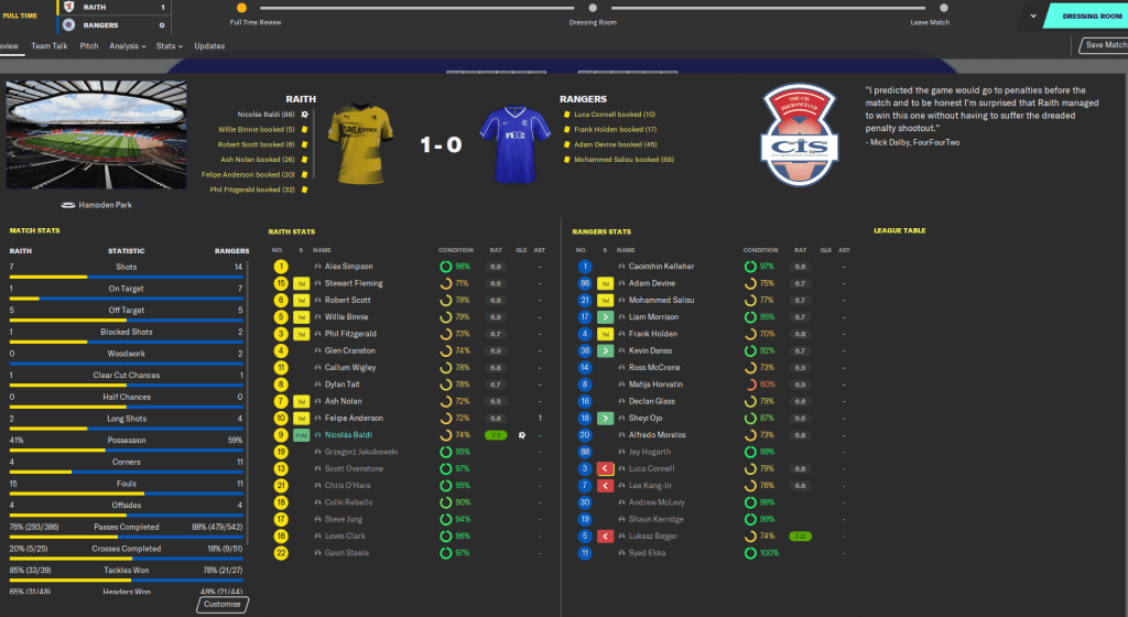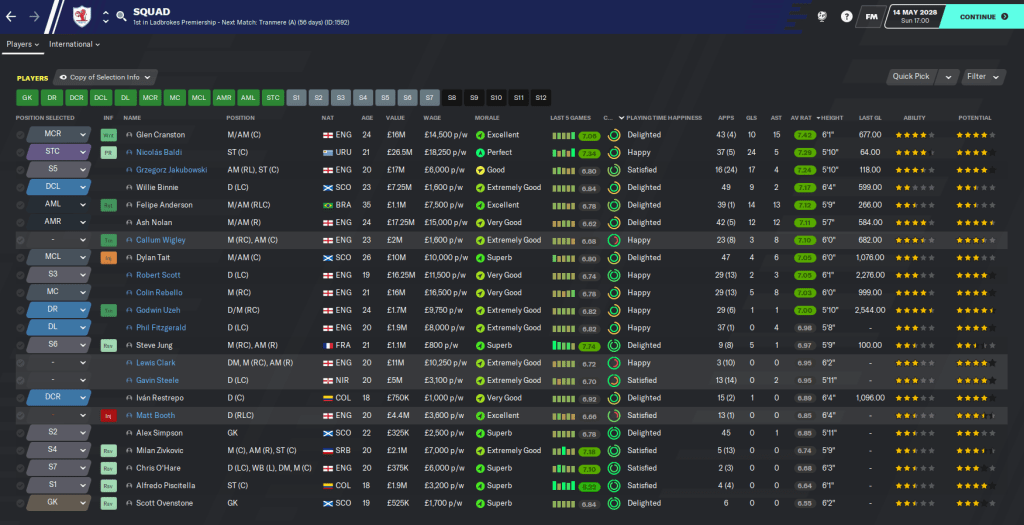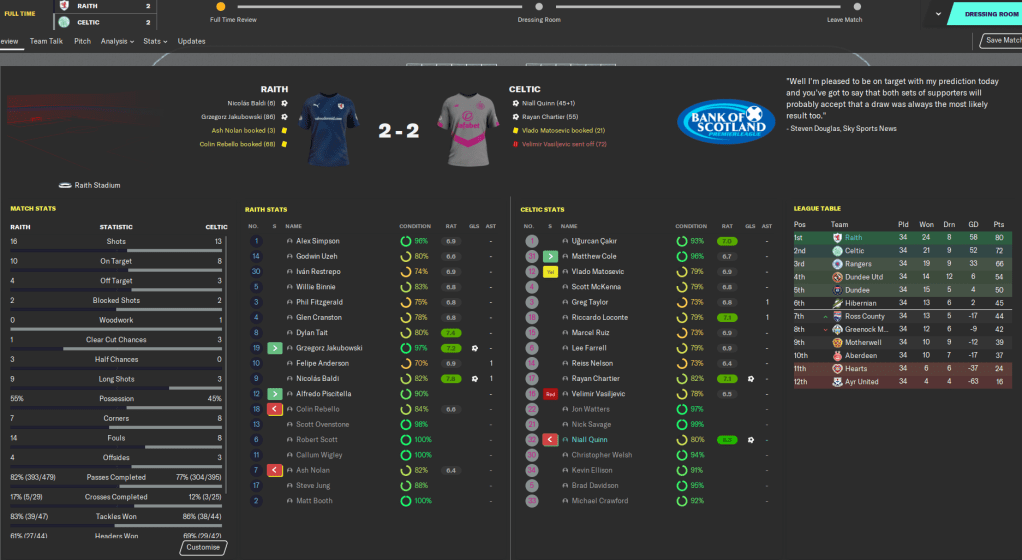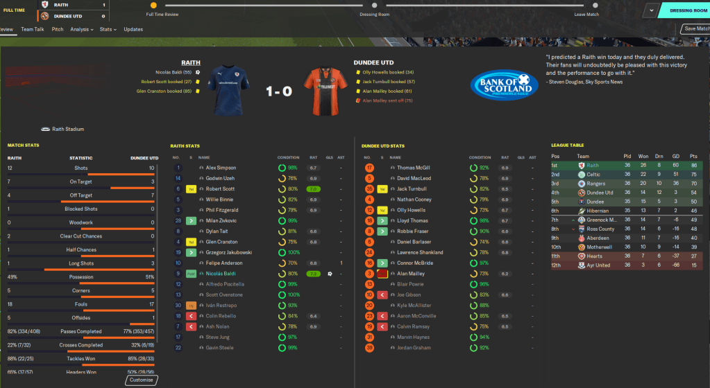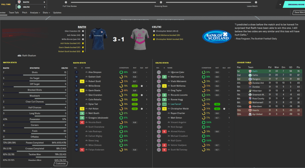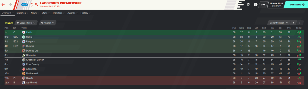 This highly successful season, in which we wrapped up a second successive Scottish title, won a League Cup and qualified for the Champions League knockout stages, is probably the last full blog in the Roth Raivers save. I’ve really enjoyed this save as it’s a little different from the usual saves where money is all that matters. Our biggest fee of this entire save has been £1.5 million and we’ve worked with minimal finances throughout, with the focus more on developing young talent and snapping up bargains.