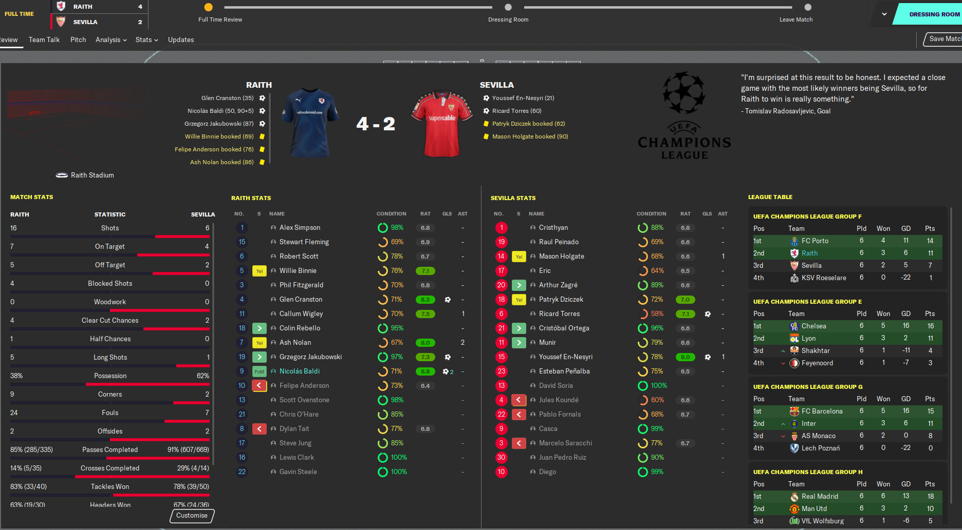 We had Phil Fitzgerald sent off after 10 minutes at home to Porto but claimed a plucky point, then were unlucky to lose 2-1 in Portugal. A draw in Belgium set up a huge decider with Sevilla, who scored with their only two shots on target but we edged past them 4-2 with late Jakubowski and Baldi goals.