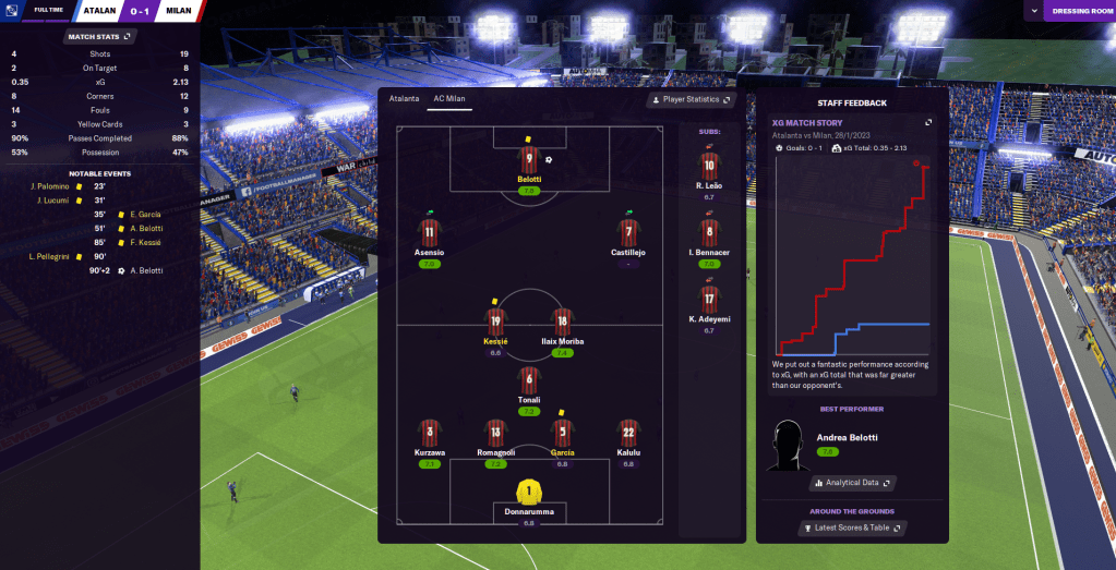 We returned to winning ways with a 4-0 thumping of Empoli in which Asensio scored a brilliant brace, then 4-1 at Parma with Talles Magno grabbing his first Milan goal and we racked up a 4.41 xG, which may be the highest I’ve seen so far. The ridiculous form continued as Ilaix Moriba inspired a 2-0 win against Fiorentina, Luís led the way in a 3-0 win at Benevento, then Belotti bagged a hat-trick in a 3-0 win over Genoa.