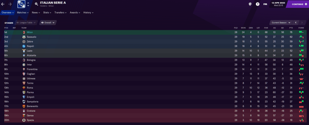 As a result, we led high-flying Sassuolo by 14 points and with a game in hand with 10 games remaining. We were also 17 clear of Juve with a game in hand, 24 clear of fourth-place Napoli and 30 clear of Inter, who were down in eighth.