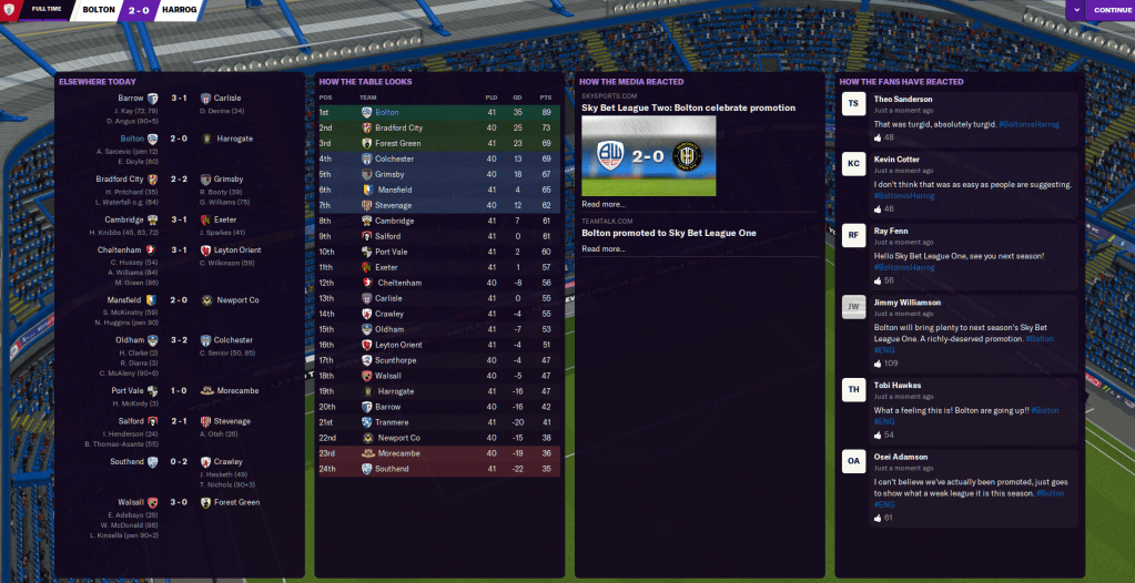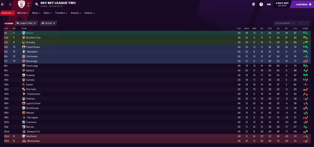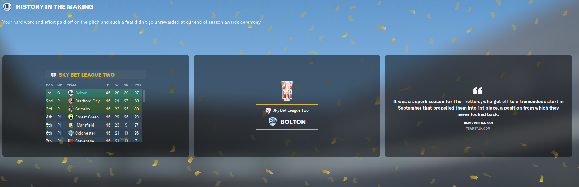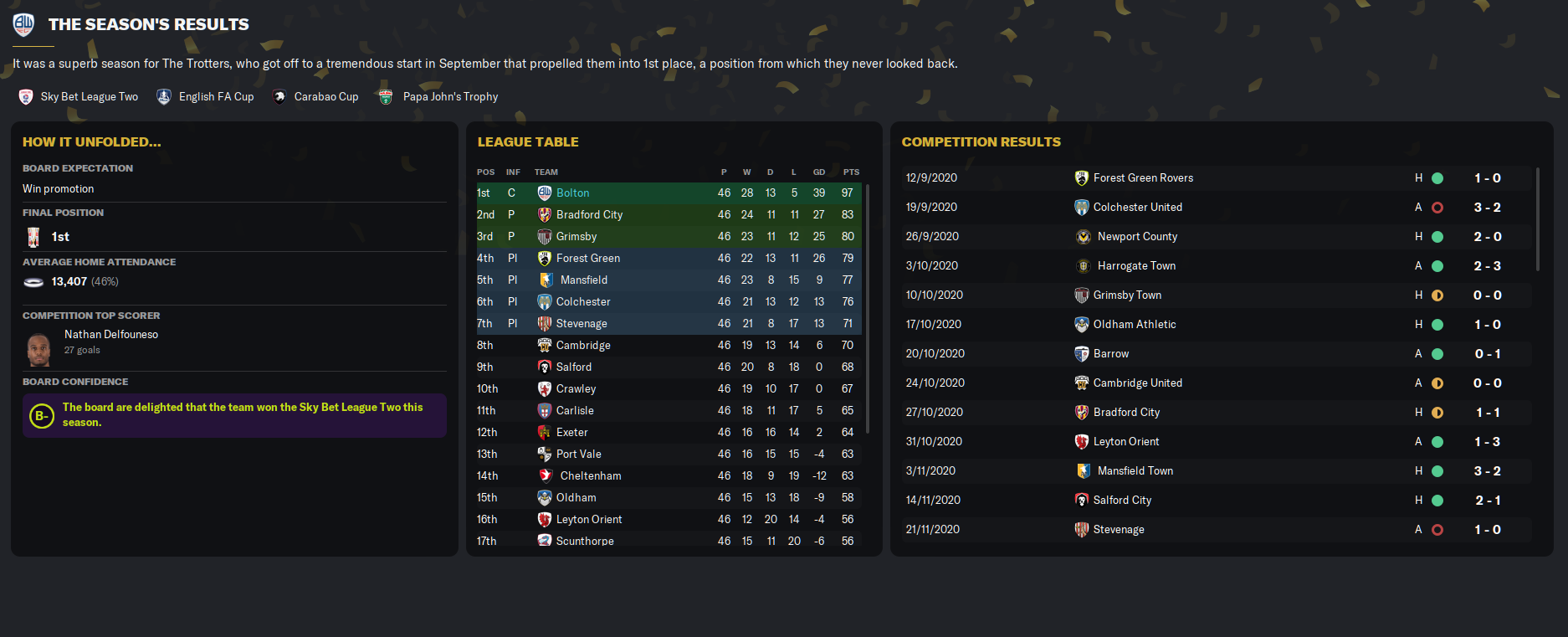 We were joined in promotion by Bradford and Grimsby, while Forest Green won the playoff final. Hull won League One and were joined by Bristol Rovers and Blackpool, who won the playoffs. Northampton, Wimbledon, Doncaster and Crewe got relegated.