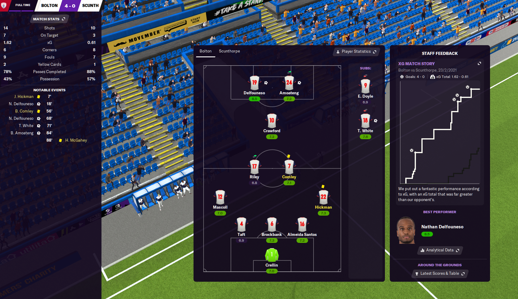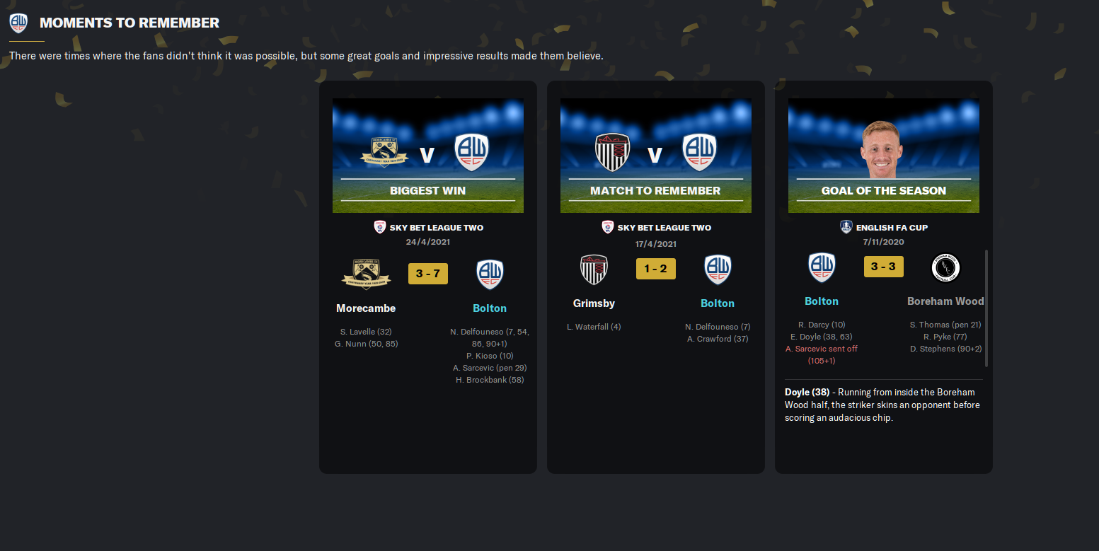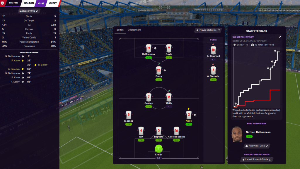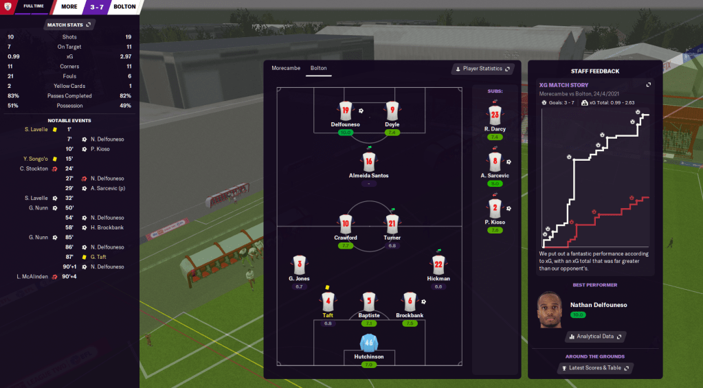 There was a hangover from this as we had a mad 3-3 draw at home to Carlisle. But that was nothing compared to the madness that ensued at bottom of the league Morecambe. We went 2-0 up inside 10 minutes and 3-0 within half an hour. We let them back into it with goals either side of half-time before Delfouneso doubled his tally then academy product centre-back Harry Brockbank scored his first for the club. They got another then Delfouneso immediately made it a hat-trick and then a delicious 25-yard chip made it four! Morecambe 3-7 Bolton… and a 10.0 rating for Delfouneso. Chaos!