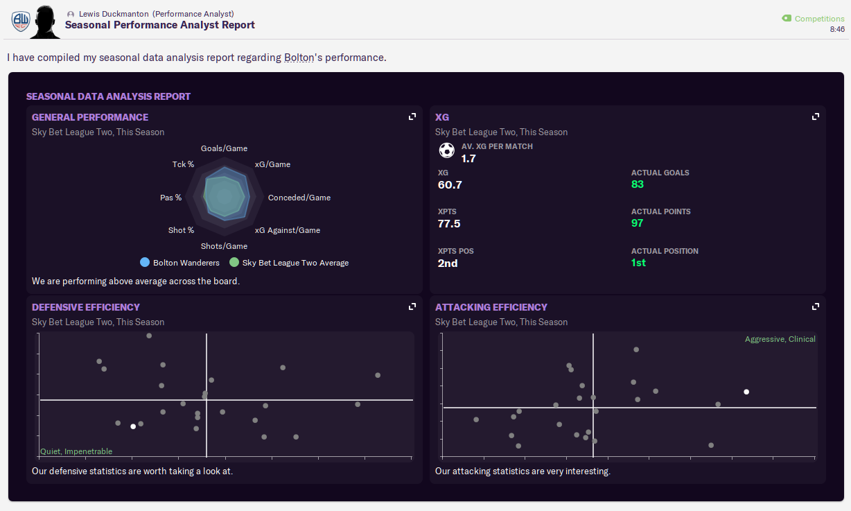 That saw us finish the campaign on 97 points and 14 points clear of Bradford, with 28 wins, 13 draws and five defeats. We also had the best attack with 83 scored and the joint-best defence with 44 conceded. That resulted in a season that my performance analyst summarised as “quiet and impenetrable defensively and aggressive and clinical offensively.” The data (on the second image below) also showed that we should have scored 23 less goals, got 20 less points and finished in second, which is interesting.