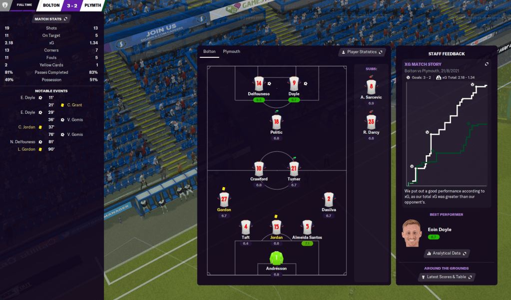 I was impressed with a narrow 2-1 loss at huge favourites Portsmouth, then a solid 1-0 win at home to Oxford United, which saw young prospect Dennis Politic make his return after 16 months out with a cruciate injury as a substitute. That also took us to 30 games unbeaten at home!