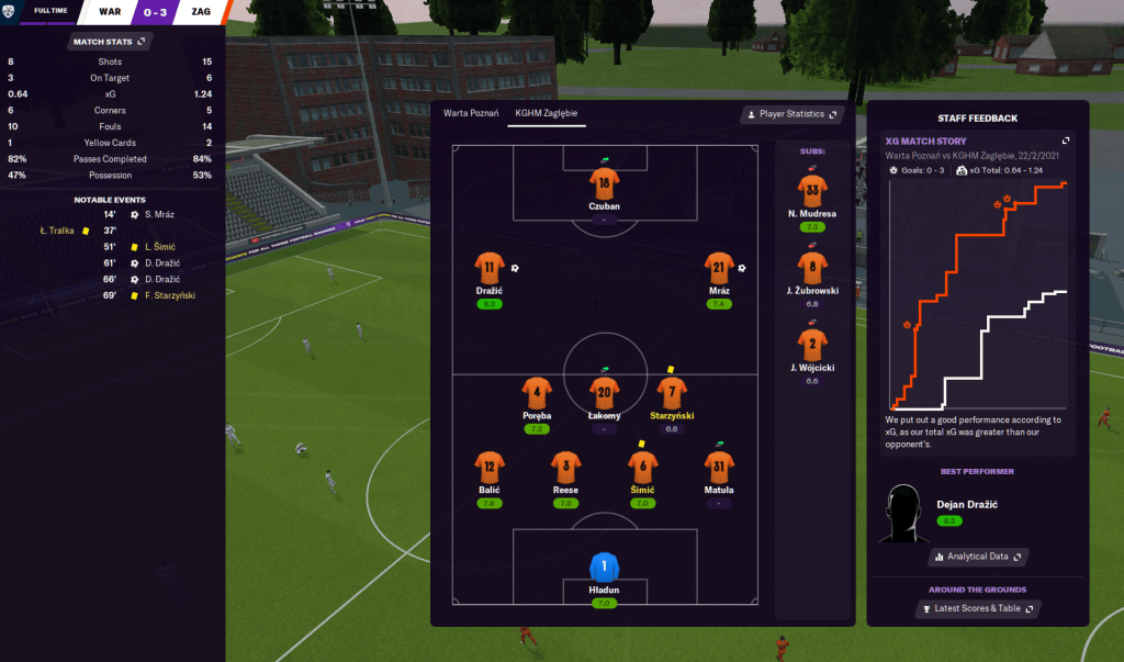 To counter that, he shifted a few things around, changed up a few player roles and it seemed to work in a 3-0 victory at Warta Poznan. The win was inspired by an excellent creative display by Latunov’s favourite workhorse Lukasz Poreba and a brace from loanee Dejan Drazic that tripled his league tally for the season.