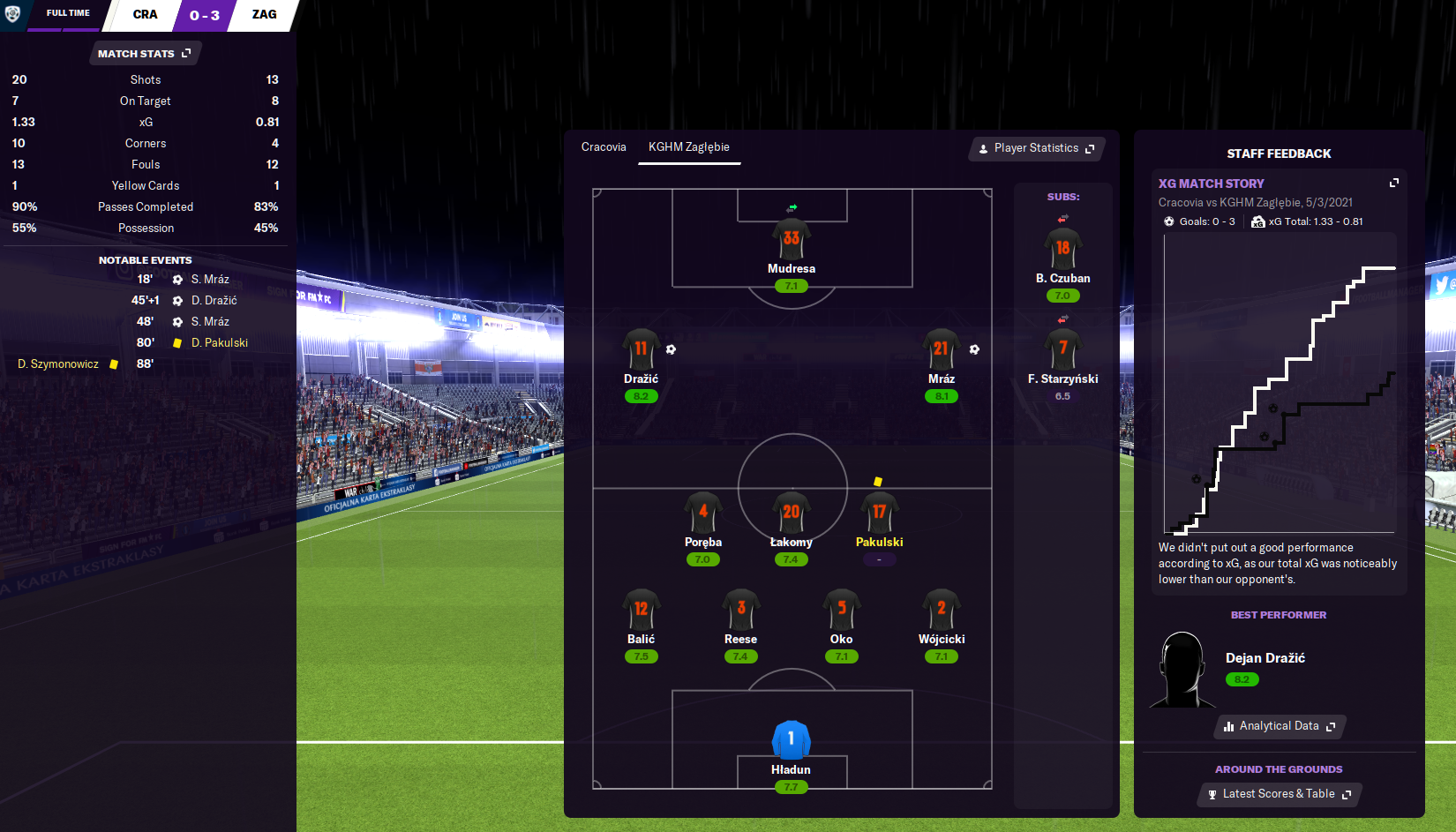 Latunov’s anger resurfaced, this time with Zivec, who was supposedly the club’s best player but had one goal and one assist at a 6.7 rating. He felt the wrath of a Latunov two-week fine, reacted negatively and bagged himself a £100,000 move away. Youngster Adam Ratajcyzk was promoted in his place and, Latunov was heard shouting at Zivec on his way out of the club, “He can’t do much worse.”