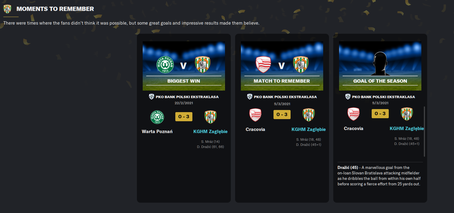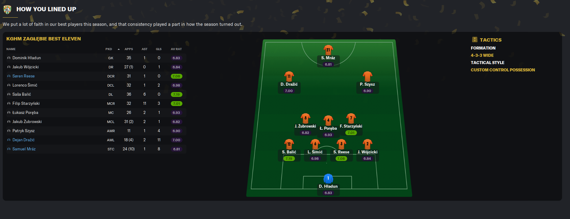 Only three Zaglebie players averaged more than a 7.00 rating all season, which is always the sign of a poor campaign. And two of those were the left-back and left centre-back. More concerningly, Drazic was the top scorer with 11 goals, and he only managed five in 17 in the league. Mraz (eight) was the only other player to score more than three goals all season.