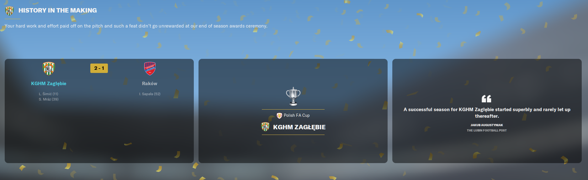 The Polish FA Cup Final came with three games of the league campaign remaining and, just to add a little intrigue to the matter, neither Zaglebie nor opponents Rakow had ever won the FA Cup before!